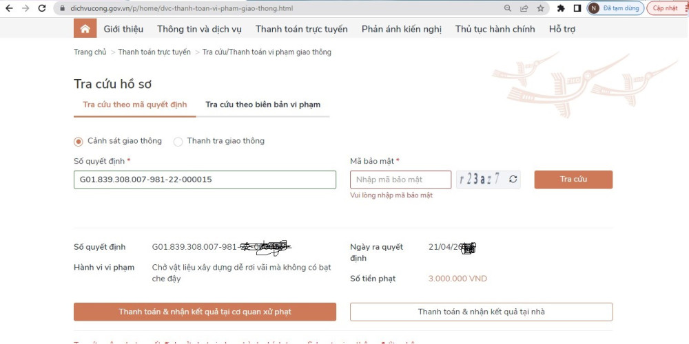 + Thanh toán trực tuyến và nhận kết quả tại cơ quan xử phạt: Người vi phạm nộp phạt qua Cổng DVC và nhận giấy tờ tạm giữ tại đơn vị CSGT ra Quyết định xử phạt.