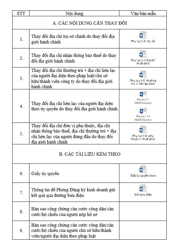 Doanh nghiệp soạn thảo hồ sơ thay đổi nội dung đăng theo mẫu Phụ lục ban hành kèm theo Thông tư số 01/2021/TT-BKHĐT ngày 16/3/2021 của Bộ Kế hoạch và Đầu tư.