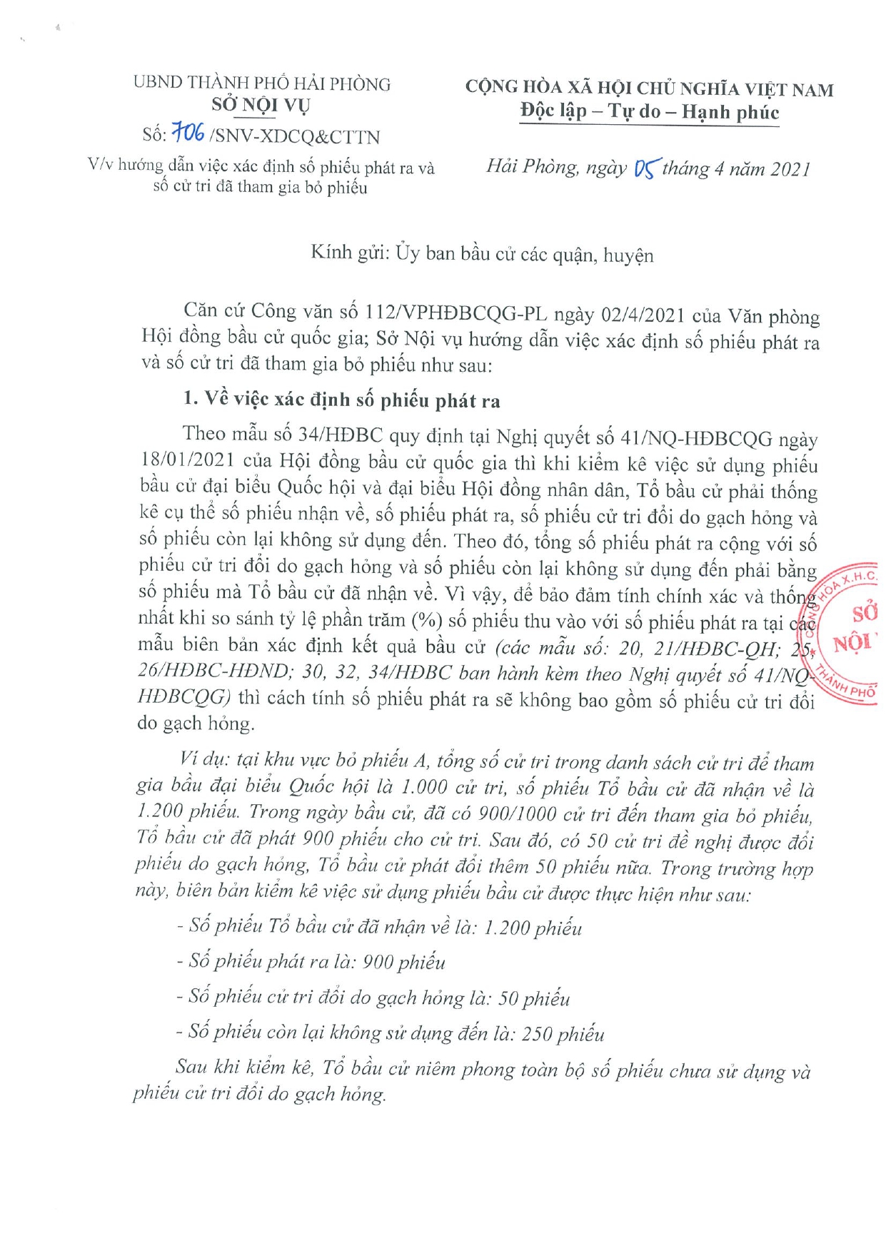 Căn cứ Công văn số 112/VPHĐBCQG-PL ngày 02/4/2021 của Văn phòng Hội đồng bầu cử quốc gia, Sở Nội vụ vừa có văn bản hướng dẫn việc xác định số phiếu phát ra và số cử tri đã tham gia bỏ phiếu.