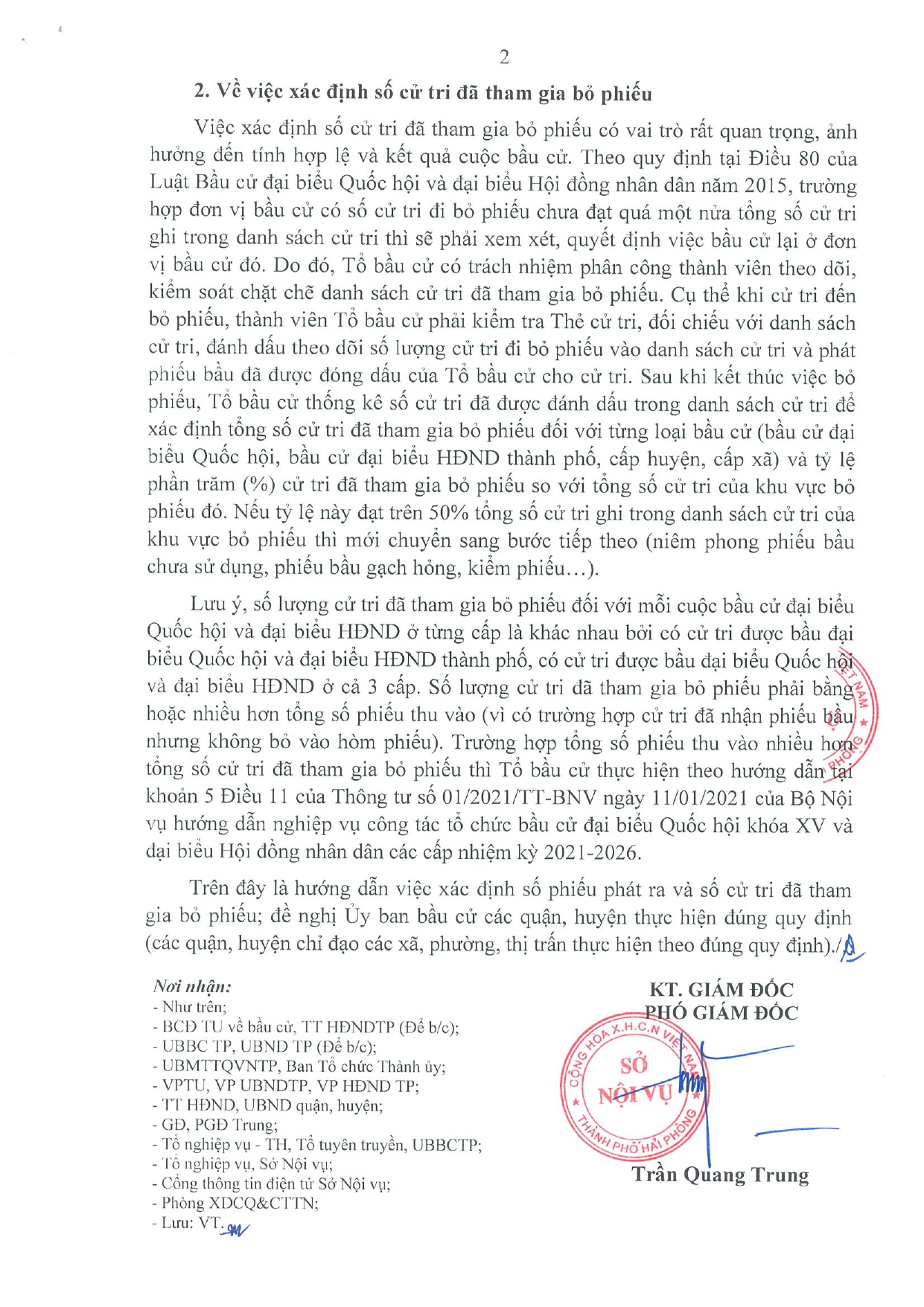 Về việc xác định số cử tri đã tham gia bỏ phiếu, theo quy định tại Điều 80 của Luật Bầu cử đại biểu Quốc hội và đại biểu Hội đồng nhân dân năm 2015, trường hợp đơn vị bầu cử có số cử tri đi bỏ phiếu chưa đạt quá một nửa tổng số cử tri ghi trong danh sách cử tri thì sẽ phải xem xét, quyết định việc bầu cử lại ở đơn vị bầu cử đó. Do đó, Tổ bầu cử có trách nhiệm phân công thành viên theo dõi, kiểm soát chặt chẽ danh sách cử tri đã tham gia bỏ phiếu. Cụ thể khi cử tri đến bỏ phiếu, thành viên Tổ bầu cử phải kiểm tra Thẻ cử tri, đối chiếu với danh sách cử tri, đánh dấu theo dõi số lượng cử tri đi bỏ phiếu vào danh sách cử tri và phát phiếu bầu đã được đóng dấu của Tổ bầu cử cho cử tri. Sau khi kết thúc việc bỏ phiếu, Tổ bầu cử thống kê số cử tri đã được đánh dấu trong danh sách cử tri để xác định tổng số cử tri đã tham gia bỏ phiếu đối với từng loại bầu cử (bầu cử đại biểu Quốc hội, bầu cử đại biểu HĐND thành phố, cấp huyện, cấp xã) và tỷ lệ phần trăm (%) cử tri đã tham gia bỏ phiếu so với tổng cử tri của khu vực bỏ phiếu đó. Nếu tỷ lệ này đạt trên 50% tổng số cử tri ghi trong danh sách cử tri của khu vực bỏ phiếu thì mới chuyển sang bước tiếp theo (niêm phong phiếu bầu chưa sử dụng, phiếu bầu gạch hỏng, kiểm phiếu…). Lưu ý, số lượng cử tri đã tham gia bỏ phiếu đối với mỗi cuộc bầu cử đại biểu Quốc hội và đại biểu HĐND ở từng cấp là khác nhau bởi có cử tri được bầu đại biểu Quốc hội và đại biểu HĐND thành phố, có cử tri được bầu đại biểu Quốc hội và đại biểu HĐND ở cả 3 cấp. Số lượng cử tri đã tham gia bỏ phiếu phải bằng hoặc nhiều hơn tổng số phiếu thu vào (vì có trường hợp cử tri đã nhận phiếu bầu nhưng không bỏ vào hòm phiếu). Trường hợp tổng số phiếu thu vào nhiều hơn tổng số cử tri đã tham gia bỏ phiếu thì Tổ bầu cử thực hiện theo hướng dẫn tại khoản 5 Điều 11 của Thông tư số 01/2021/TT-BNV ngày 11/01/2021 của Bộ Nội vụ hướng dẫn nghiệp vụ công tác tổ chức bầu cử đại biểu Quốc hội khóa XV và đại biểu HĐND các cấp nhiệm kỳ 2021 – 2026.