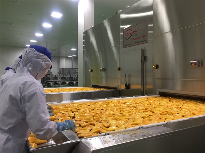 Nhà máy chế biến nông sản công nghệ cao chế biến rau củ quả theo quy trình: xử lý trái cây tươi, đông lạnh, sấy trái cây, cô đặc, đóng chai.