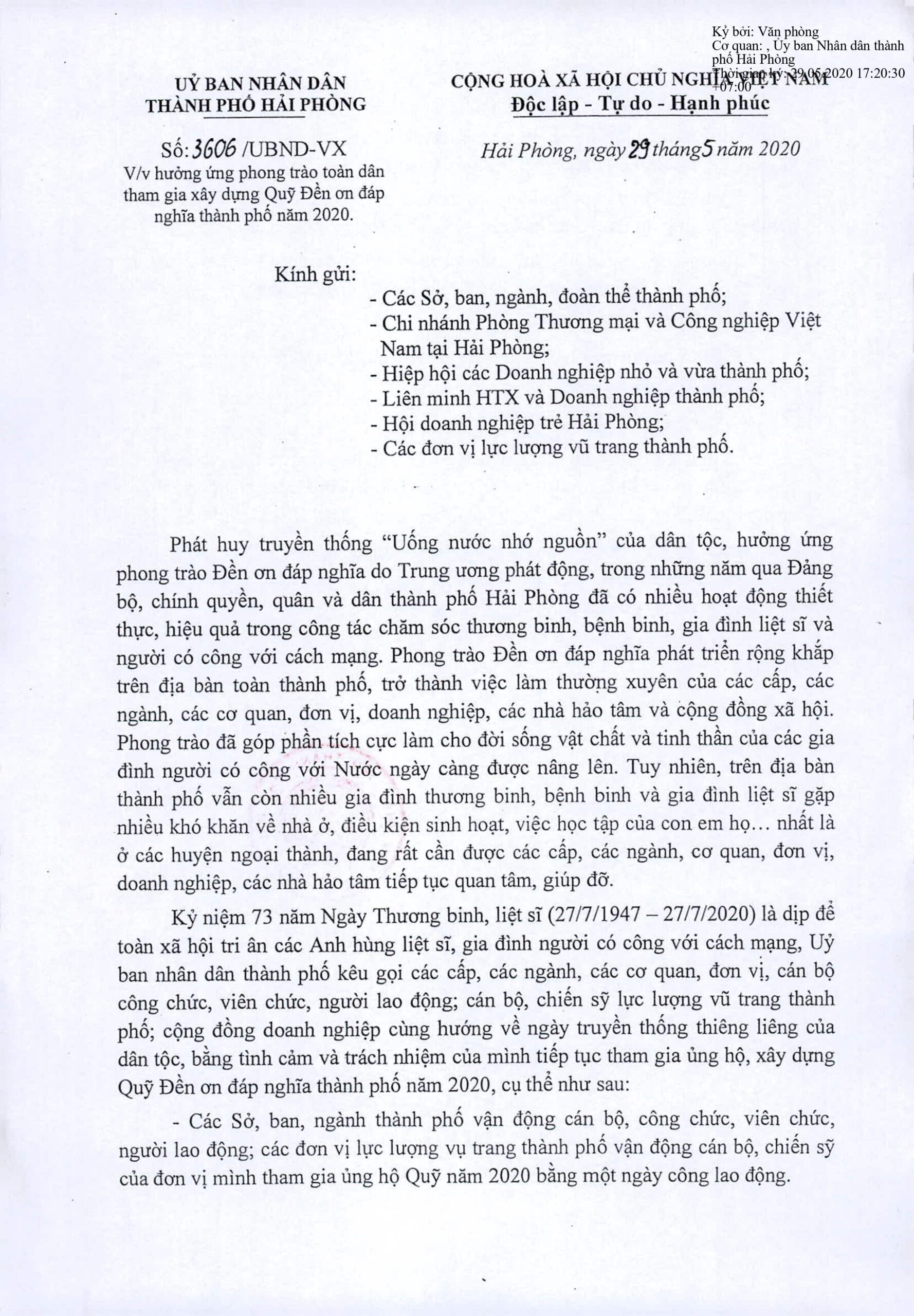 Ủy ban nhân dân thành phố vừa có Công văn số 3606/UBND-VX ngày 29/5/2020 về việc hưởng ứng phong trào toàn dân tham gia xây dựng Quỹ Đền ơn đáp nghĩa thành phố năm 2020, nhân dịp kỷ niệm 73 năm Ngày Thương binh, liệt sĩ (27/7/1947 – 27/7/2020).