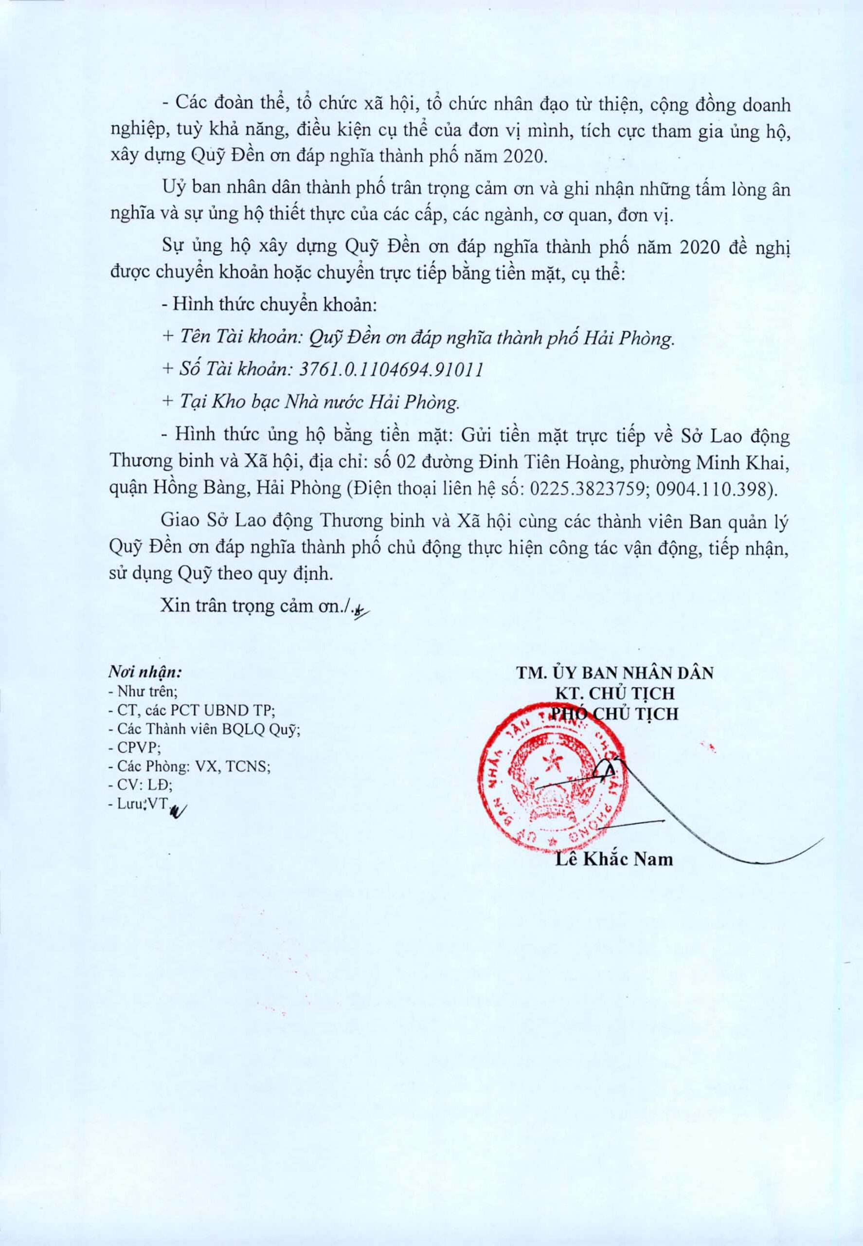 – Các đoàn thể, tổ chức xã hội, tổ chức nhân đạo từ thiện, cộng đồng doanh nghiệp, tùy khả năng, điều kiện cụ thể của đơn vị mình, tích cực tham gia ủng hộ xây dựng Quỹ Đền ơn đáp nghĩa thành phố năm 2020.