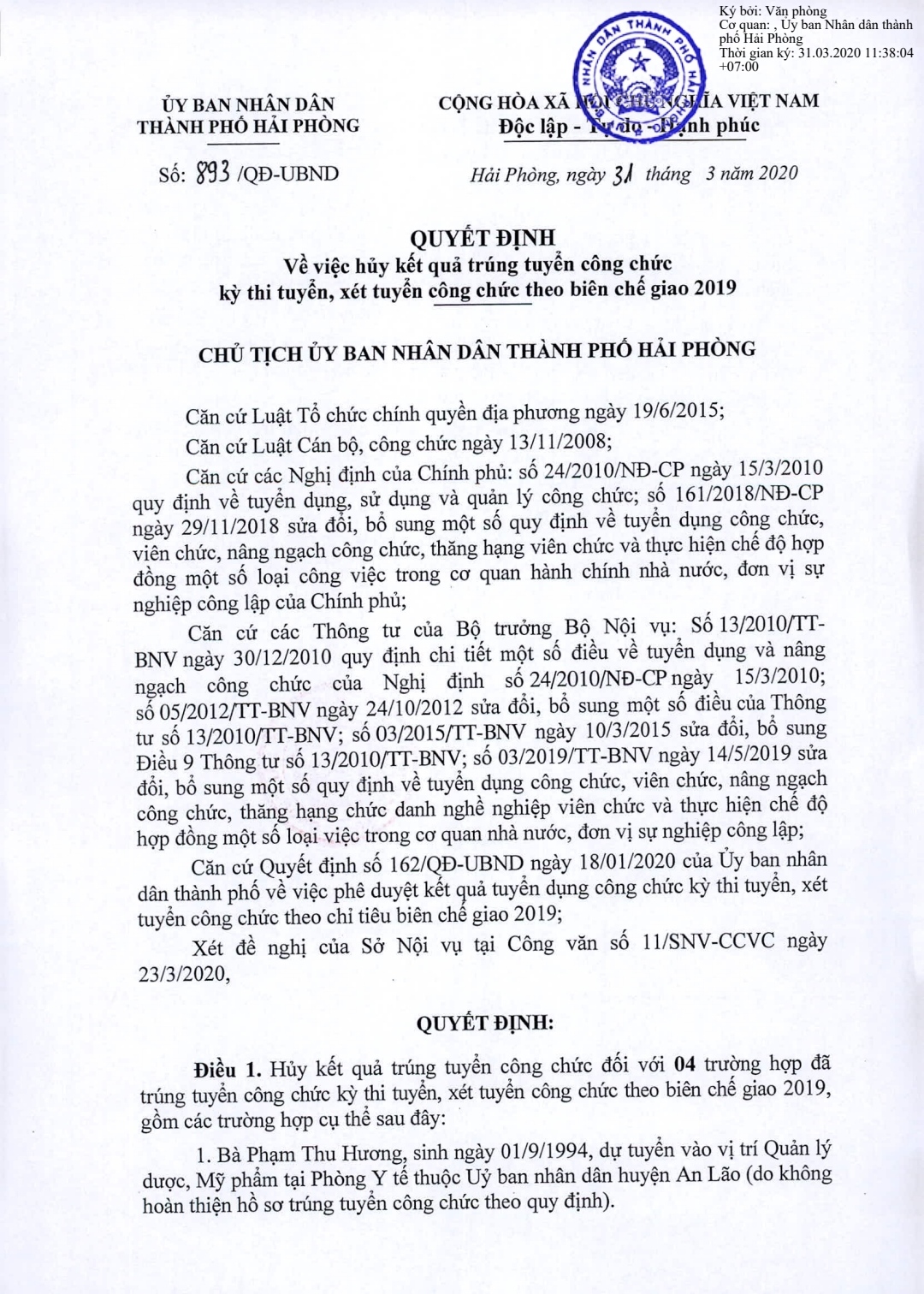 Quyết định số 893/QĐ-UBND ngày 31/3/2020 của UBND thành phố Hủy kết quả trúng tuyển công chức kỳ thi tuyển, xét tuyển công chức theo biên chế giao 2019.