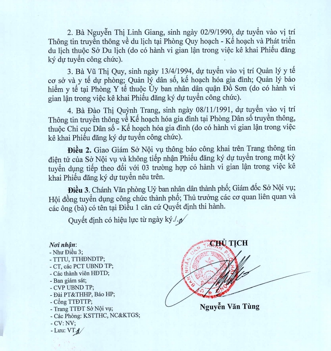 Theo đó, hủy kết quả trúng tuyển công chức đối với 04 trường hợp đã trúng tuyển công chức kỳ thi tuyển, xét tuyển công chức theo biên chế giao 2019. Cụ thể: