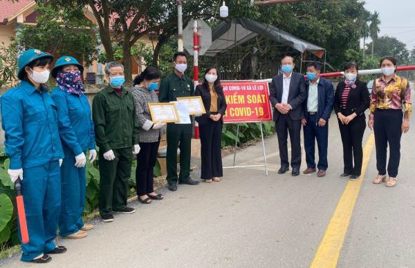 Trong cùng ngày, đồng chí Trần Thị Bích Ngọc, Phó Bí thư Thường trực Huyện ủy, Chủ tịch HĐND huyện cũng đi thăm, động viên và trao giấy khen cho Tổ công tác và cá nhân cho tập thể, cá nhân Tổ công tác phòng, chống dịch bệnh COVID-19 số 03, xã Lê Lợi; đồng chí Nguyễn Trường Sơn, Phó Bí thư Huyện ủy đi thăm, động viên và trao giấy khen cho tập thể, cá nhân Tổ công tác phòng, chống dịch bệnh Covid-19 số 01, xã Lê Thiện; các đồng chí Ủy viên Ban Thường vụ Huyện ủy, phụ trách các đảng bộ xã, thị trấn cũng đi thăm và trao giấy khen cho các tập thể, cá nhân có thành tích xuất sắc trong công tác phòng, chống dịch bệnh COVID-19 trên địa bàn.