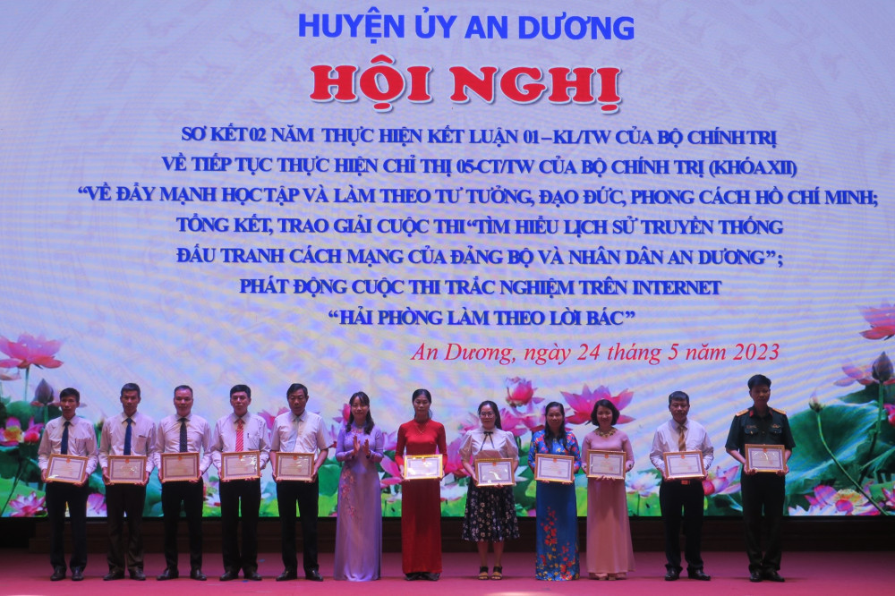 Sáng 24/5, tại Nhà Văn hóa huyện An Dương, Huyện ủy An Dương tổ chức Hội nghị sơ kết 2 năm Kết luận 01-KL/TW tiếp tục thực hiện Chỉ thị số 05-CT/TW ngày 15/5/2012 của Bộ Chính trị (khóa XII) về “Đẩy mạnh học tập và làm theo tư tưởng, đạo đức, phong cách Hồ Chí Minh”; Biểu dương các tập thể, cá nhân xuất sắc trong học tập và làm theo Bác; Tổng kết, trao giải Cuộc thi “Tìm hiểu Lịch sử truyền thống đấu tranh cách mạng của Đảng bộ và Nhân dân huyện An Dương” và Phát động Cuộc thi trắc nghiệm trên Internet “Hải Phòng làm theo lời Bác”.