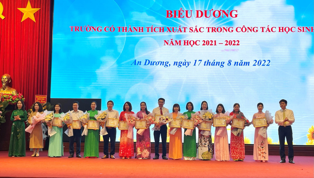 Tại Hội nghị, UBND huyện đã biểu dương và khen thưởng 7 em học sinh đạt thành tích cao trong kỳ thi tuyển sịnh vào lớp 10 năm học 2022-2023 (đỗ vào lớp 10 chuyên Trần Phú), 01 em học sinh đạt điểm cao trong Kỳ thi tốt nghiệp THPT năm 2022; 14 tập thể, 103 cá nhân có thành tích xuất sắc trong công tác bồi dưỡng học sinh giỏi, các kỳ thi giao lưu năm học 2021-2022; 143 học sinh đạt giải học sinh giỏi quốc gia, thành phố, đạt giải trong các kỳ thi giao lưu quốc tế và khu vực.