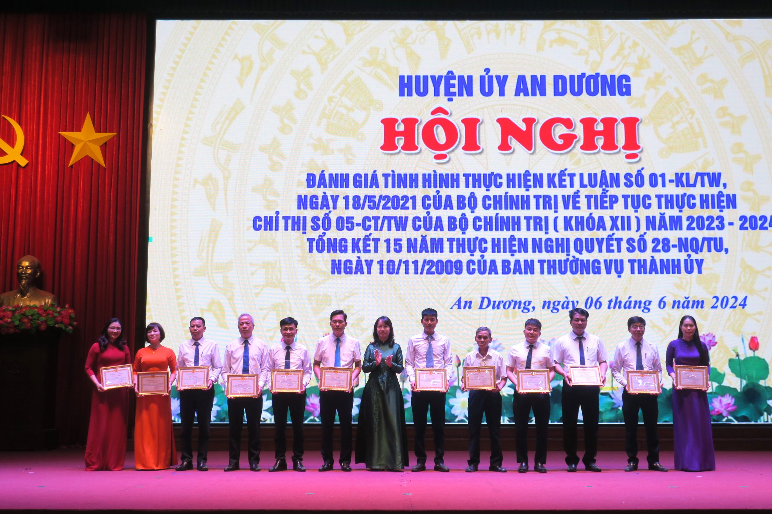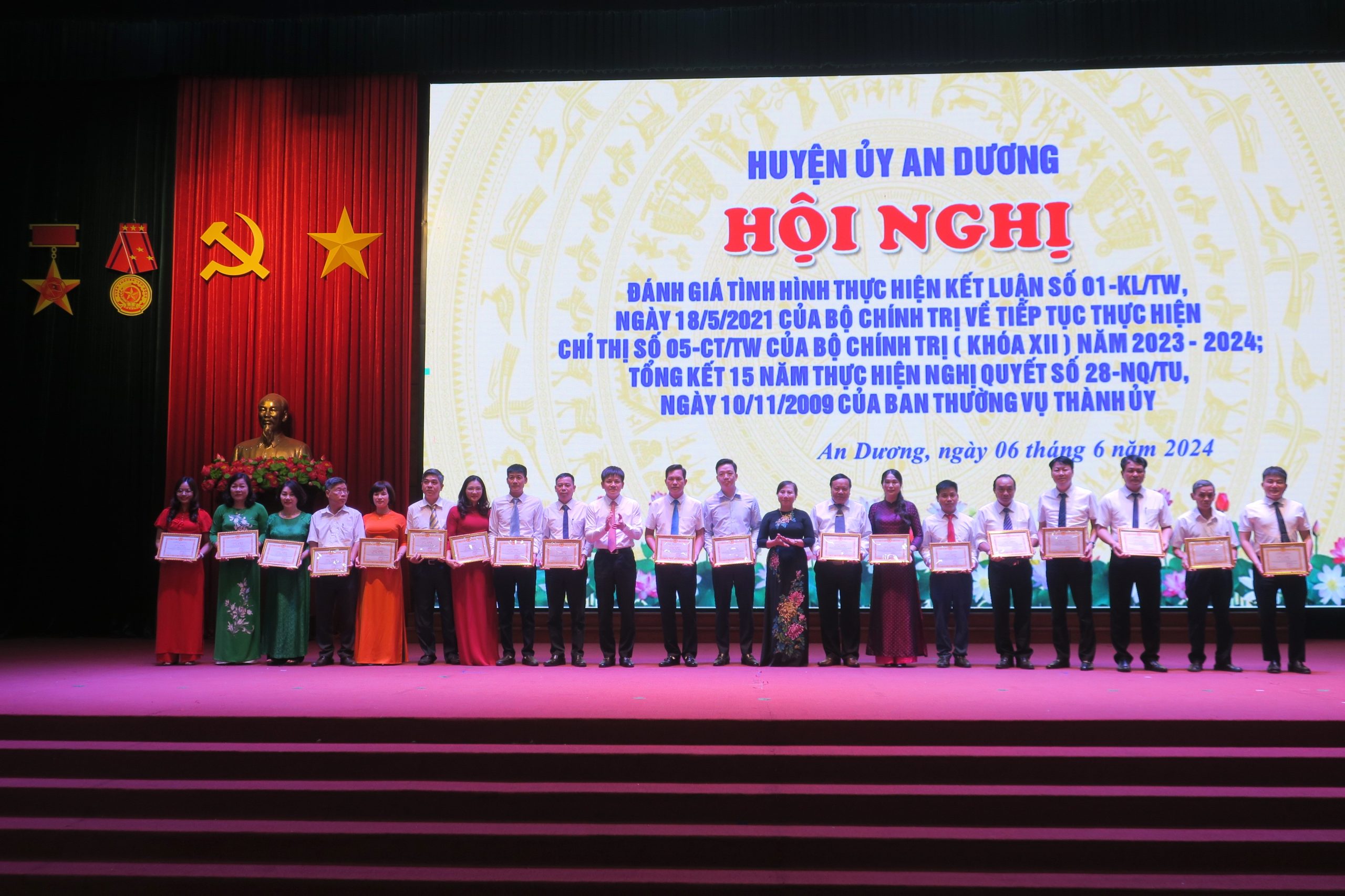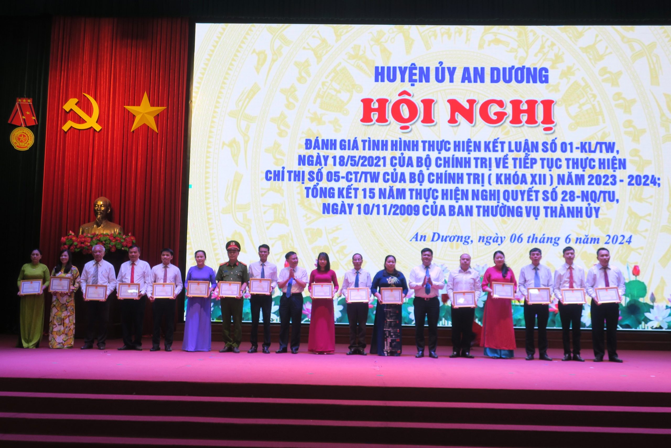 Nhân dịp này, Ban Chấp hành Đảng bộ huyện An Dương tặng Giấy khen cho 12 tập thể vào 20 cá nhân có thành tích xuất sắc trong 15 năm thực hiện Nghị quyết 28-NQ/TU. UBND huyện tặng Giấy khen cho 18 tập thể và 32 cá nhân có thành tích xuất sắc trong thực hiện Kết luận số 01-KL/TW ngày 18/5/2021 của Bộ Chính trị.