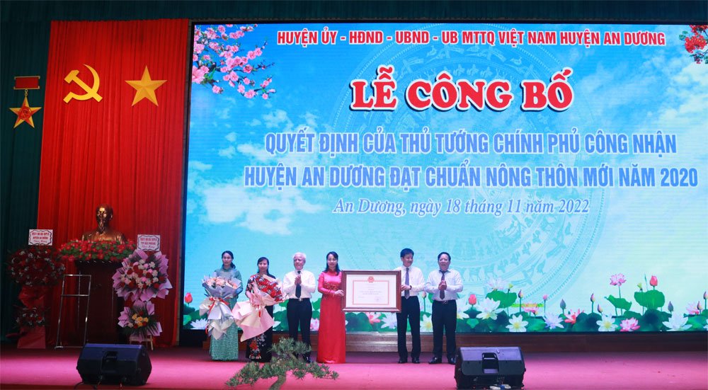 Phát biểu tại lễ đón nhận, đồng chí Nguyễn Đức Thọ, Phó Chủ tịch UBND TP Nguyễn Đức Thọ chúc mừng, biểu dương kết quả mà huyện An Dương đã đạt được trong xây dựng nông thôn mới thời gian qua.