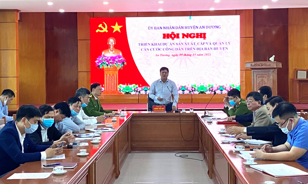 Chiều 9/3, UBND huyện An Dương tổ chức Hội nghị triển khai Dự án sản xuất, cấp và quản lý căn cước công dân trên địa bàn huyện. Đồng chí Lương Thế Quý, Phó Chủ tịch UBND huyện dự và chủ trì hội nghị, cùng dự có lãnh đạo Công an huyện và các ban ngành đoàn thể nhân dân huyện; Chủ tịch UBND, Trưởng Công an các xã, thị trấn trên địa bàn huyện.
