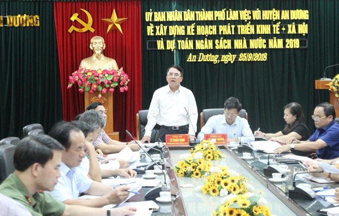 Chiều 25/9, Phó Chủ tịch UBND thành phố Lê Khắc Nam chủ trì buổi làm việc với huyện An Dương về tình hình thực hiện chủ đề năm 2018, kết quả thực hiện kế hoạch phát triển kinh tế – xã hội và dự toán thu – chi ngân sách Nhà nước năm 2018; xây dựng kế hoạch phát triển kinh tế – xã hội và dự toán ngân sách Nhà nước năm 2019. Cùng dự có đại diện lãnh đạo các Sở, ban, ngành, địa phương.