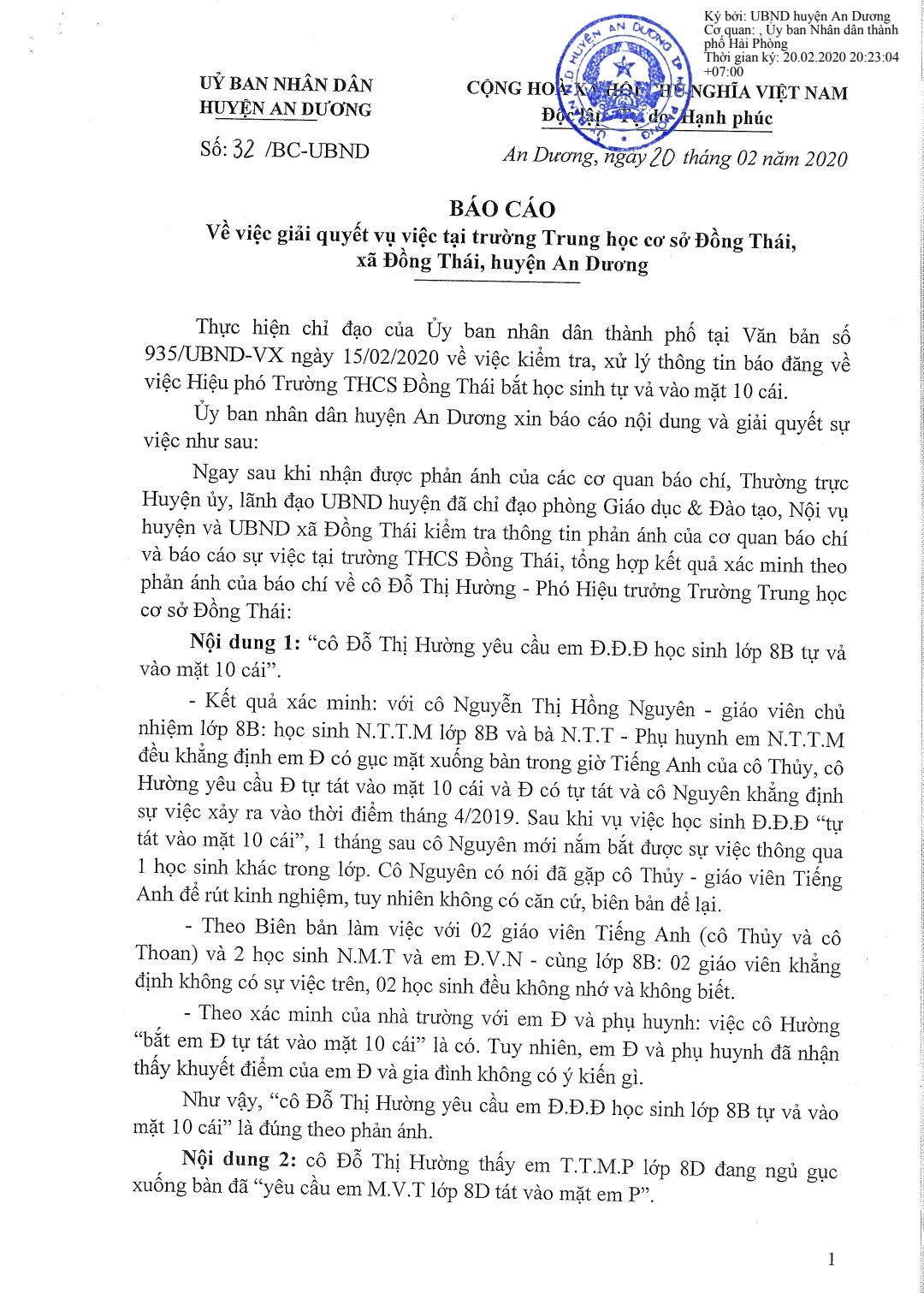 Theo báo cáo số 32/BC-UBND ngày 20/02/2020 của UBND huyện An Dương, qua các nội dung phản ánh của cơ quan báo chí, kết quả xác minh cho thấy, cô Đỗ Thị Hường – Phó Hiệu trưởng Trường THCS Đồng Thái đã có hành vi vi phạm đạo đức nhà giáo và các quy định về công tác quản lý giáo dục đối học sinh trong nhà trường làm ảnh hưởng tới dư luận, nhân dân, giáo viên và học sinh. Cùng với đó, tập thể Ban giám hiệu, Hội đồng sư phạm, Ban Chấp hành công đoàn và một số giáo viên Trường THCS Đồng Thái đã thiếu trách nhiệm trong công tác quản lý, thực hiện Điều lệ và đạo đức nhà giáo.