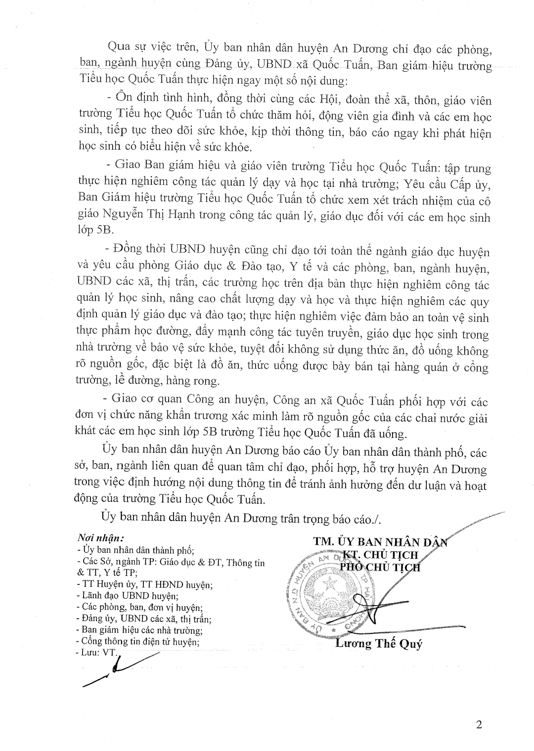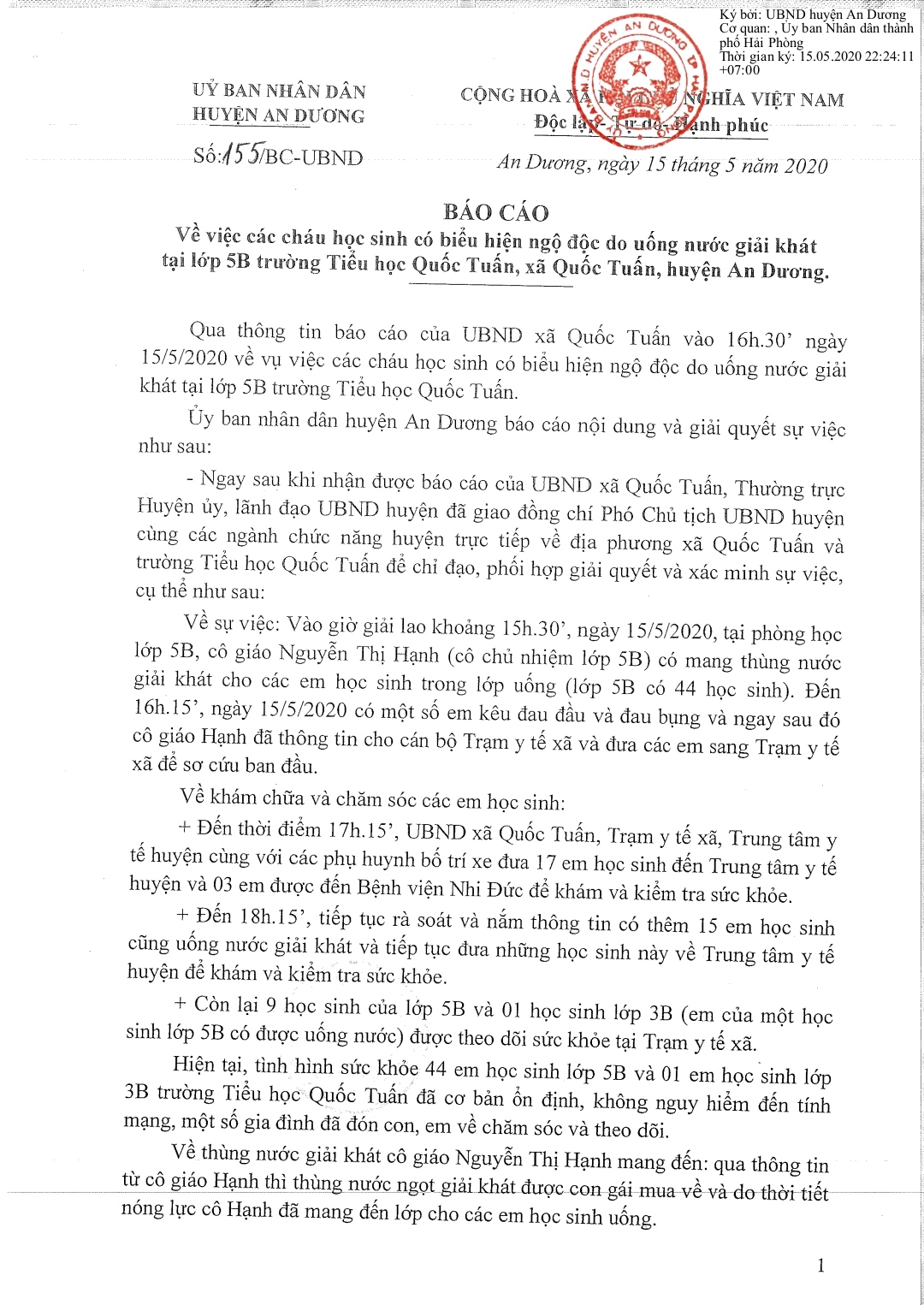UBND huyện An Dương đã có văn bản thông tin vụ việc các cháu học sinh lớp 5B Trường Tiểu học Quốc Tuấn, xã Quốc Tuấn có biểu biện ngộ độc do uống nước giải khát vào ngày 15/5/2020, cụ thể như sau: