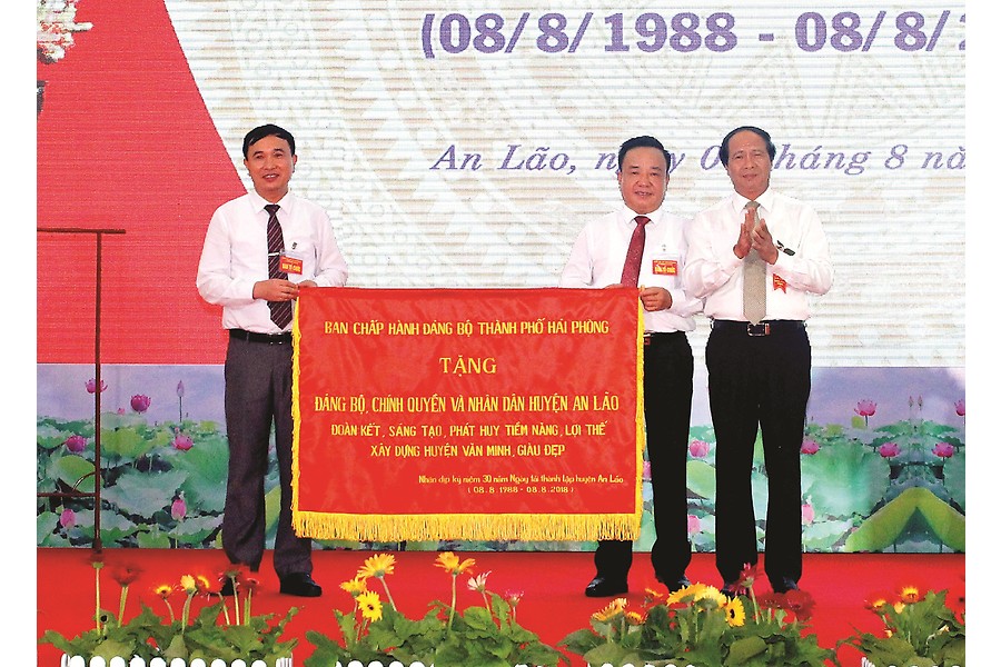 Nhân dịp này, đồng chí Lê Văn Thành, Bí thư Thành ủy, Chủ tịch HĐND thành phố trao bức trướng của Ban chấp hành Đảng bộ thành phố mang dòng chữ “Đoàn kết, sáng tạo, phát huy tiềm năng, lợi thế xây dựng huyện văn minh, giàu đẹp” tặng Đảng bộ, chính quyền và nhân dân huyện An Lão. Các đồng chí: Nguyễn Thị Nghĩa, Phó bí thư Thường trực Thành ủy, Trưởng đoàn đại biểu Quốc hội Hải Phòng; Nguyễn Văn Tùng, Chủ tịch UBND thành phố trao bằng khen của UBND thành phố tặng 10 tập thể và cá nhân có thành tích xuất sắc trong xây dựng, phát triển huyện 30 năm qua.