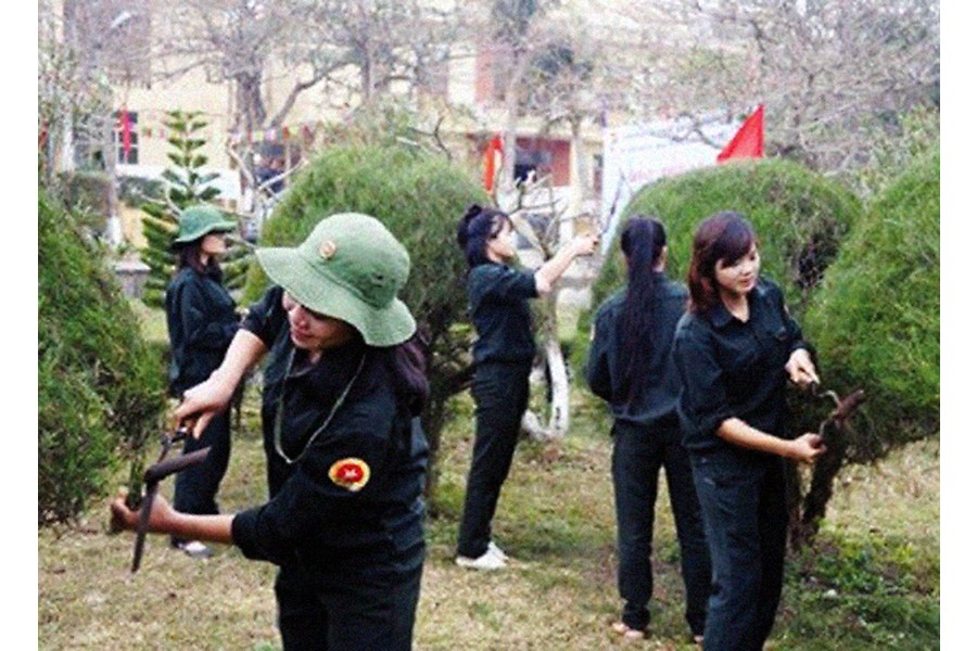 Đội viên thanh niên xung phong Bạch Long Vỹ chỉnh trang cây cảnh trong Công viên tuổi trẻ Sông Hồng.