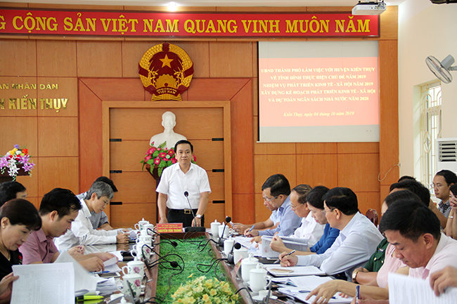 Chiều 4/10, tại trụ sở UBND huyện Kiến Thụy, UBND thành phố làm việc với huyện Kiến Thụy về tình hình thực hiện Chủ đề năm 2019, kết quả thực hiện kế hoạch phát triển kinh tế – xã hội và dự toán thu – chi ngân sách nhà nước năm 2019; xây dựng kế hoạch phát triển kinh tế – xã hội và dự toán năm 2020. Đồng chí Nguyễn Văn Thành, Phó Chủ tịch UBND thành phố chủ trì. Tham dự có lãnh đạo, sở, ban, ngành, UBND huyện Kiến Thụy và các đơn vị liên quan.