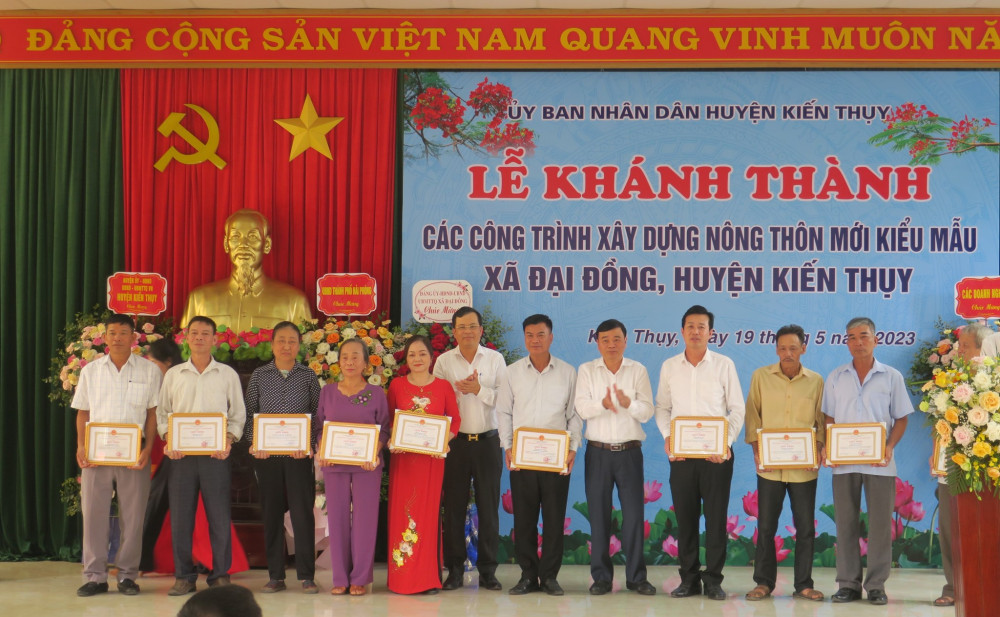 Ghi nhận những nỗ lực trong thời gian qua, tại chương trình, UBND huyện Kiến Thụy đã trao tặng Giấy khen cho 2 tập thể và 10 cá nhân có thành tích xuất sắc trong công tác hiến đất, tháo dỡ công trình GPMB xây dựng các tuyến đường nông thôn mới kiểu mẫu xã Đại Đồng.