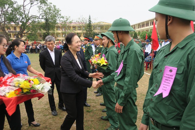 Phó Bí thư Thường trực Thành ủy, Trưởng đoàn Đại biểu quốc hội Hải Phòng Nguyễn Thị Nghĩa tặng hoa, động viên các tân binh