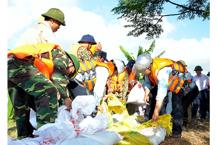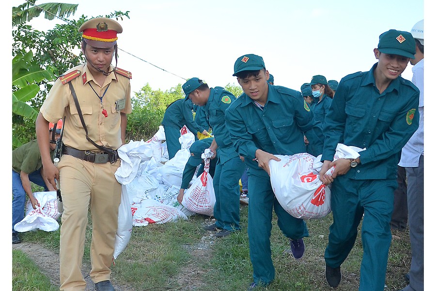 Tình huống giả định, bão số 5, có sức gió gần tâm bão mạnh cấp 11, giật trên cấp 12, gây mưa to, sóng lớn kèm theo nước sông Cấm dâng cao xấp xỉ mặt đê tuyến ngoài tả sông Cấm. Mang công Hải Giỏ bị sóng vỗ làm xói lở lớn, nếu không xử lý kịp thời sẽ làm đê bị vỡ. Trong khi đó, vị trí phái ngoài cống có một số người gặp nạn, có nguy cơ đuối nước cần được cứu nạn.