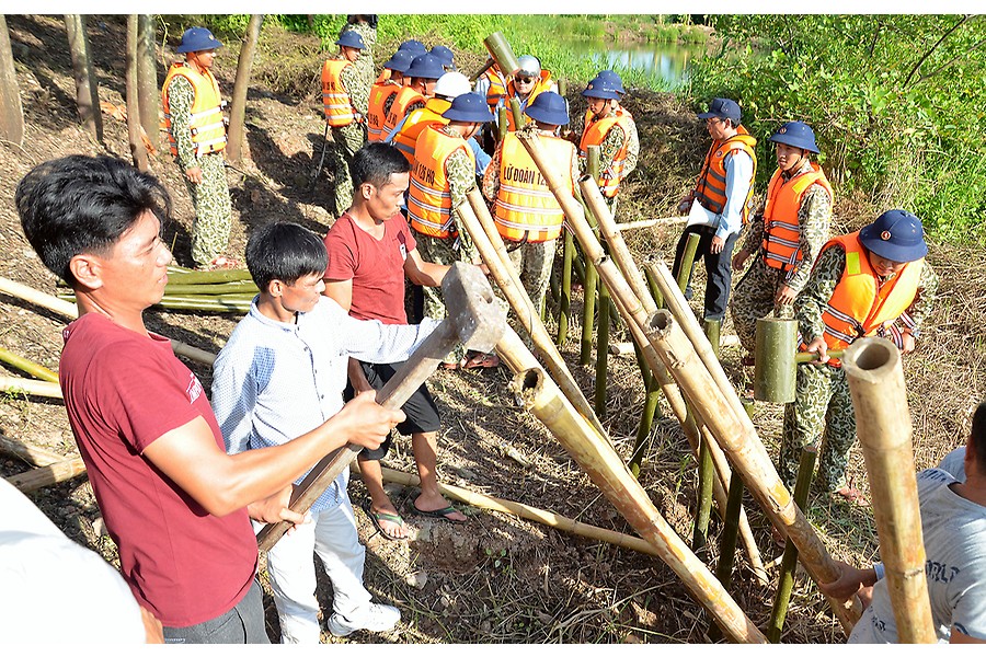 Các lực lượng dùng cọc tre đóng chặn chống xói lở cống Hai Giỏ.