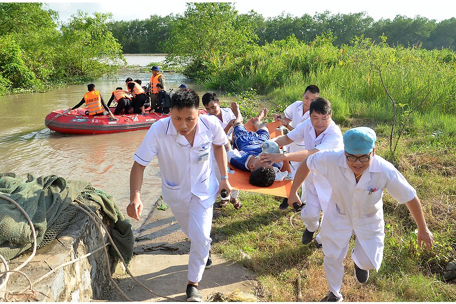 Chiến sĩ Lữ đoàn 126 Hải quân cùng lực lượng y tế cứu người bị nạn đưa vào bờ.