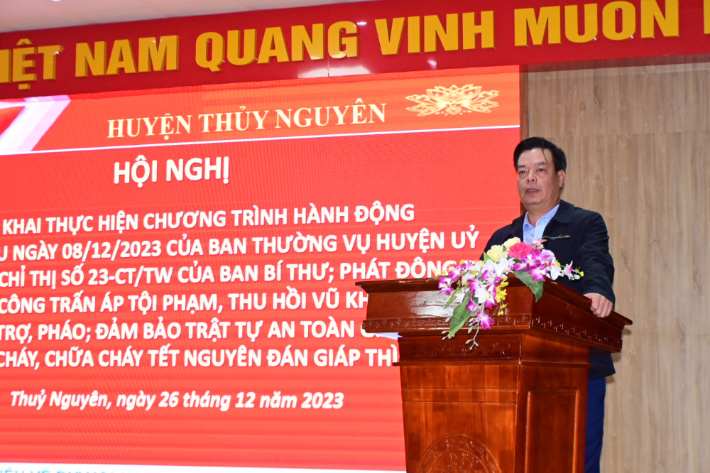 Sáng 26/12, Huyện Thủy Nguyên tổ chức Hội nghị phát động đợt cao điểm tấn công trấn áp tội phạm, thu hồi vũ khí, vật liệu nổ, công cụ hỗ trợ (VK-VLN-CCHT), pháo; bảo đảm trật tự ATGT và PCCC Tết nguyên đán 2024.