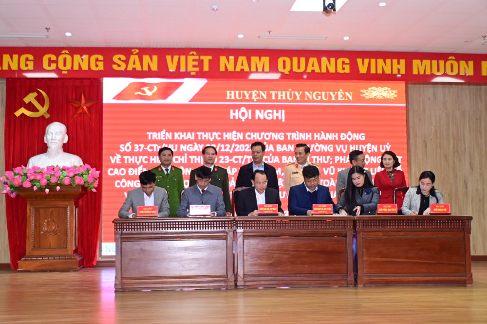 Tại Hội nghị, đại diện các phòng ban, cơ quan, đoàn thể chính trị-xã hội, chủ tịch UBND các xã, thị trấn, khối các trường THPT, THCS ký cam kết với chủ tịch UBND huyện về thực hiện các quy định về trật tự an toàn giao thông đường bộ, phòng cháy, chữa cháy và vận động, thu hồi, quản lý, phòng ngừa, đấu tranh với tội phạm, vi phạm pháp luật về vũ khí, vật liệu nổ, công cụ hỗ trợ, pháo trong dịp Tết Nguyên đán Giáp Thìn 2024./.