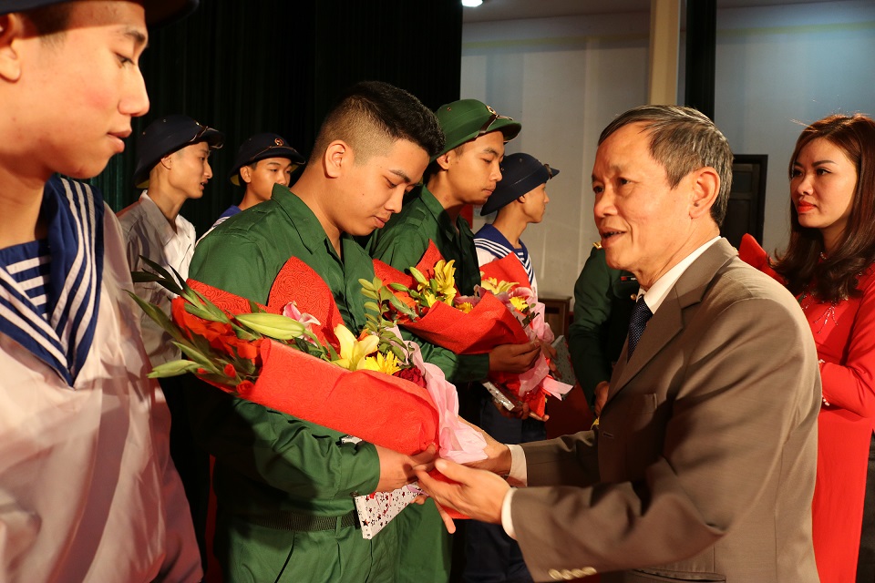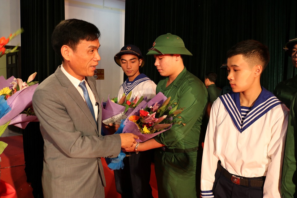 Đồng chí Bùi Văn Vi, Chủ tịch UBND huyện, Chủ tịch Hội đồng nghĩa vụ Quân sự huyện Thủy Nguyên tặng hoa chúc mừng các tân binh