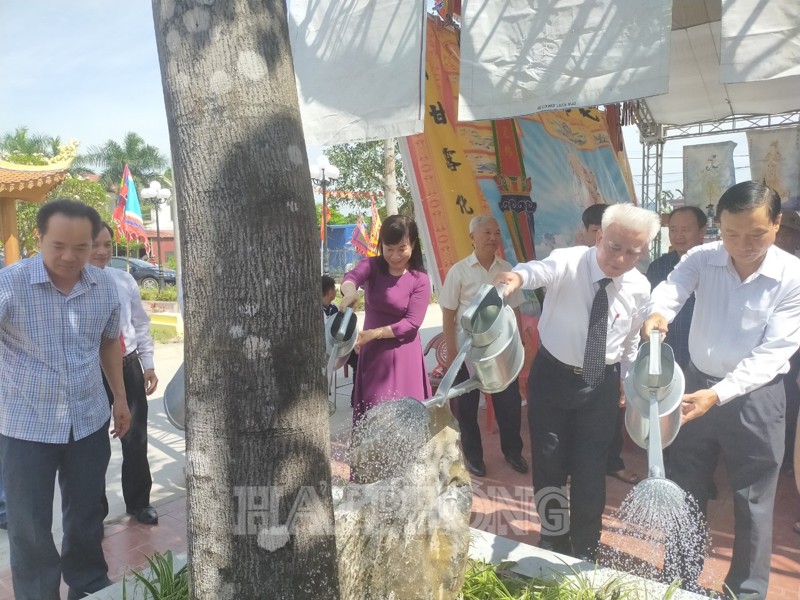 Đồng chí Nguyễn Đình Chuyến cùng đại diện lãnh đạo huyện Tiên Lãng cắt băng khánh thành, đưa công trình tu bổ, tôn tạo đền Hà Đới vào sử dụng.