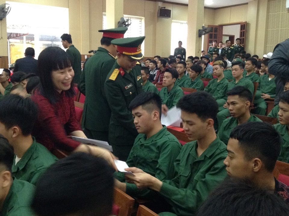 Đồng chí Nguyễn Thị Mai Phương- Bí thư Huyện ủy Tiên Lãng trao quà động viên thanh niên lên đường nhập ngũ