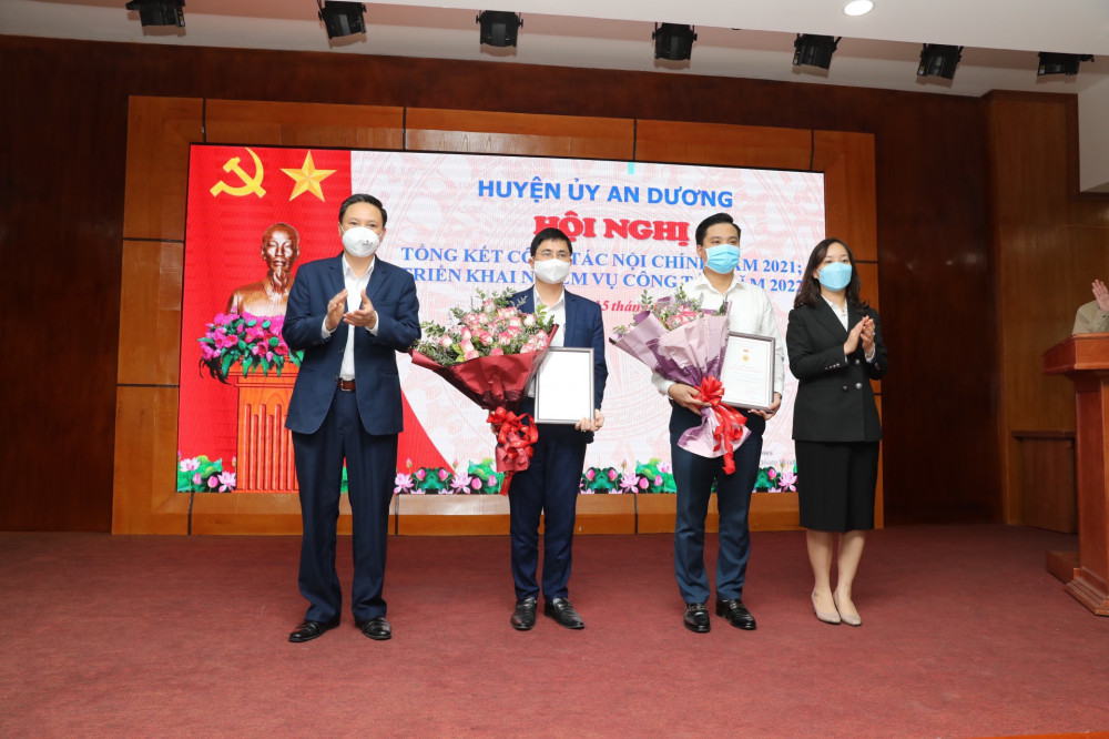 Cũng tại hội nghị, thừa ủy quyền của cấp khen thưởng, đồng chí Đặng Bá Cường, Ủy viên Ban Thường vụ, Trưởng Ban Nội chính Thành ủy, đồng chí Trần Thị Quỳnh Trang, Ủy viên Thành ủy, Bí thư Huyện ủy đã trao tặng kỷ niệm chương “Vì sự nghiệp Nội chính Đảng” và tặng hoa chúc mừng các đồng chí Đinh Văn Quyền, Chánh Văn phòng huyện và đồng chí Phạm Duy Thành, Chuyên viên Văn phòng huyện vinh dự được nhận kỷ niệm chương đợt này.