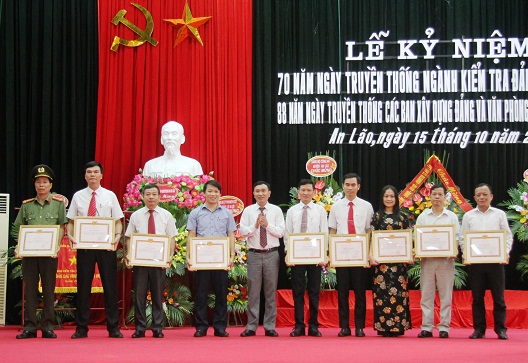 Nhân dịp này, Huyện ủy An Lão đã tổ chức trao Kỷ niệm chương “Vì sự nghiệp kiểm tra của Đảng” do Ủy ban kiểm tra Trung ương tặng 4 đồng chí, trao Kỷ niệm chương “Vì sự nghiệp dân vận” cho 4 đồng chí thuộc Đảng bộ huyện; trao Cờ thi đua đơn vị dẫn đầu khối huyện năm 2017 của UBND TP cho Ủy ban kiểm tra Huyện ủy; tặng giấy khen cho 4 tập thể và 5 cá nhân đã có thành tích xuất sắc trong công tác xây dựng Đảng thời gian qua.