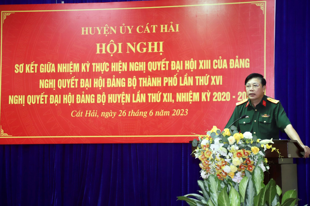 Ghi nhận và biểu dương những kết quả Đảng bộ huyện Cát Hải đạt được trong nửa đầu nhiệm kỳ 2020-2025, đại tá Nguyễn Minh Quang, Ủy viên Ban Thường vụ Thành ủy, Chỉ huy trưởng Bộ Chỉ huy Quân sự thành phố đề nghị Ban Chấp hành Đảng bộ huyện rà soát lại các chỉ tiêu, nhiệm vụ để kịp thời bổ sung các giải pháp, biện pháp phù hợp, khả thi nhằm đẩy mạnh hoàn thành các chỉ tiêu đã đề ra. Từ nay đến hết nhiệm kỳ, Huyện ủy Cát Hải tiếp tục bám sát các chỉ tiêu chưa đạt, bổ khuyết nhiệm vụ, giải pháp để triển khai hiệu quả; đổi mới phương thức lãnh đạo, chỉ đạo, tiếp tục xác định xây dựng Đảng là nhiệm vụ then chốt, tăng cường đào tạo cán bộ, nhất là cán bộ trẻ; nâng cao chất lượng đội ngũ cán bộ, đảng viên có bản lĩnh chính trị vững vàng, đáp ứng yêu cầu nhiệm vụ./.