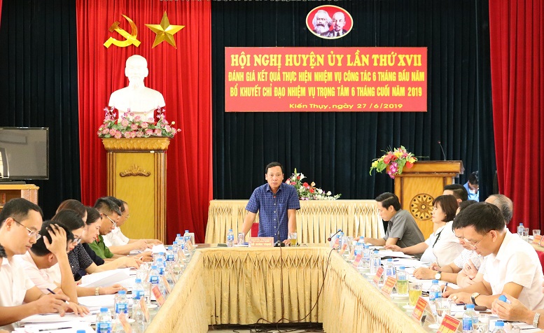 Sáng 27-6, Huyện ủy Kiến Thụy tổ chức hội nghị Huyện ủy lần thứ 17 đánh giá kết quả thực hiện nhiệm vụ công tác 6 tháng đầu năm, bổ khuyết nhiệm vụ 6 tháng cuối năm. Dự hội nghị có đồng chí Đặng Bá Cường, Trưởng ban Nội chính Thành ủy.