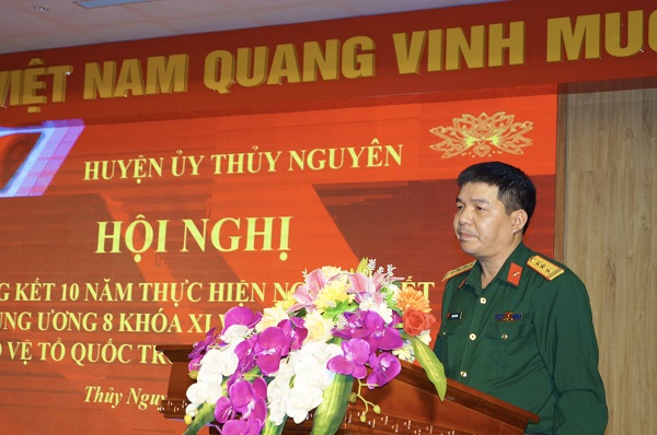 Phát biểu tại Hội nghị, đồng chí Đoàn Xuân Hoà, Uỷ viên ban thường vụ Huyện uỷ, Chỉ huy trưởng Bộ chỉ huy Quân sự huyện nhấn mạnh, Huyện ủy đã tập trung lãnh đạo, chỉ đạo phát triển kinh tế xã hội kết hợp chặt chẽ với quốc phòng bảo đảm an ninh, giải quyết tốt các vấn đề xã hội, bảo đảm mỗi bước phát triển kinh tế là một bước tăng cường tiềm lực quốc phòng an ninh.