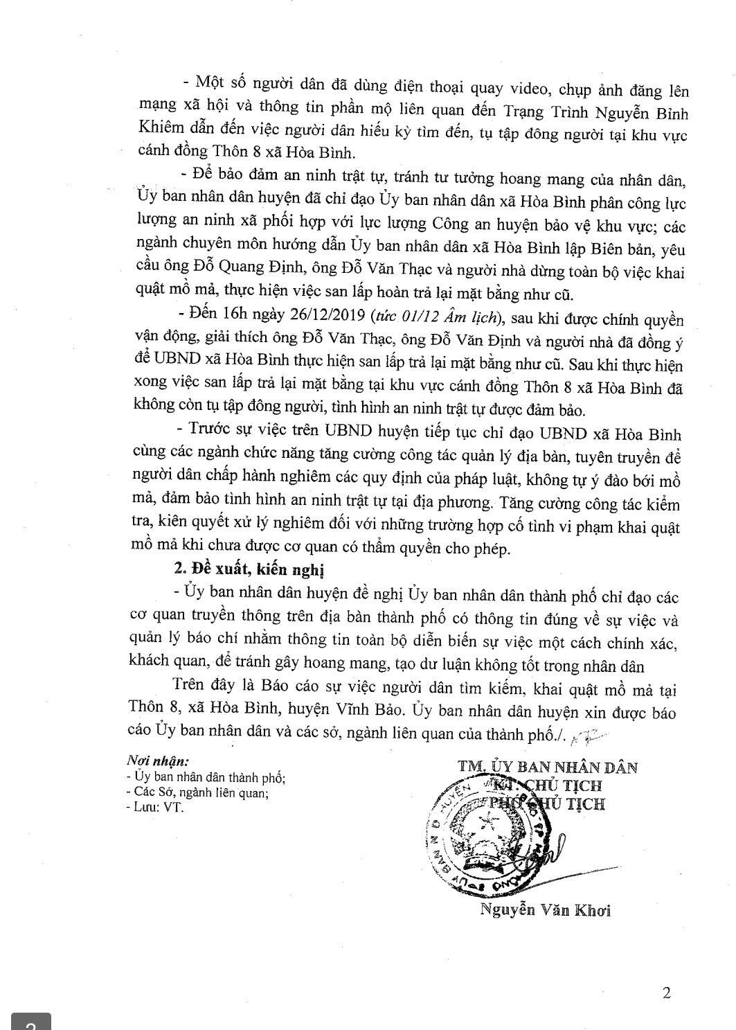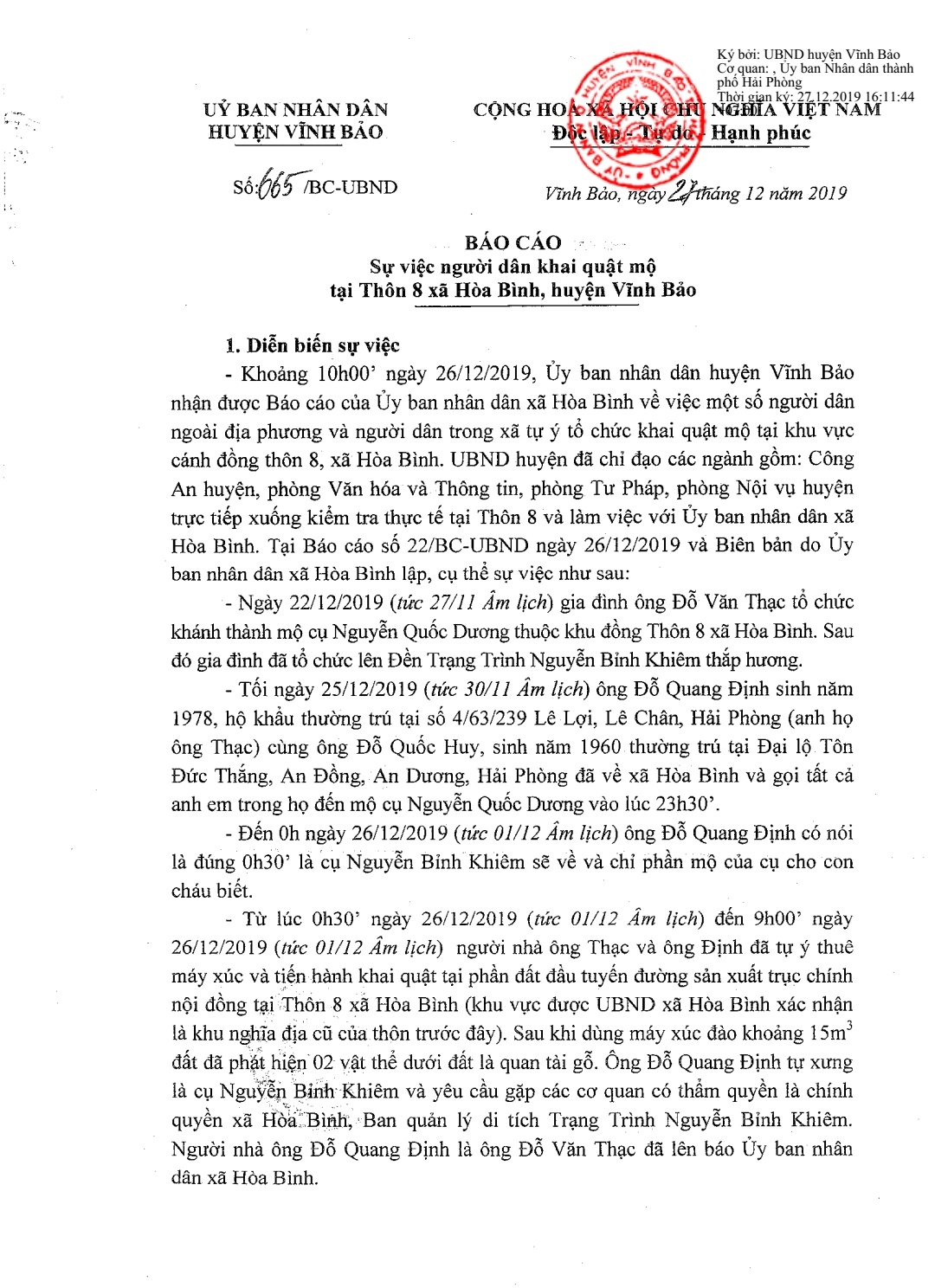 Báo cáo của UBND huyện Vĩnh Bảo về vụ việc người dân tự ý khai quật mộ tại Thôn 8, xã Hòa Bình.