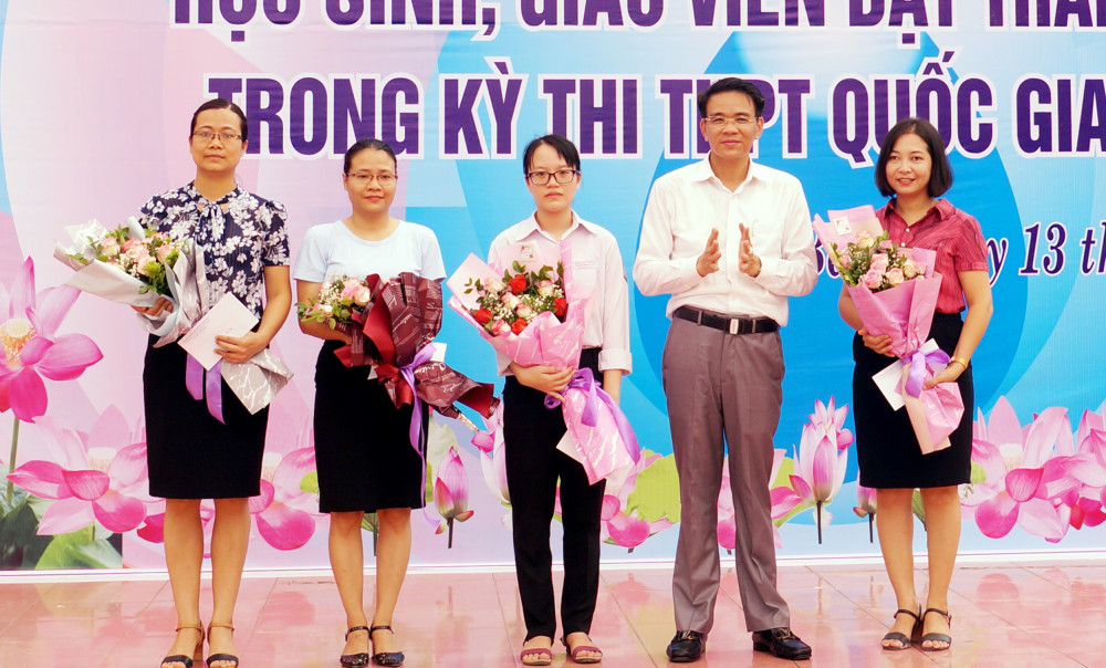 Cụ thể, tại trường THPT Vĩnh Bảo, đồng chí Phạm Quốc Ka-Bí thư Huyện uỷ đã biểu dương em Phạm Thị Hương Giang đã đạt 28,25 điểm tổ hợp A01, đứng thứ hai thành phố và cô giáo Cao Thuý Hằng-giảng dạy môn Toán, cô Phạm Thị Lan Phương-giảng dạy môn Ngoại ngữ và thầy Đoàn Việt Ánh-giảng dạy môn Vật lý.