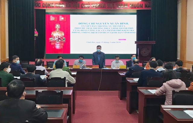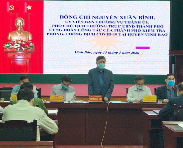 Phát biểu với cán bộ chủ chốt huyện Vĩnh Bảo, đồng chí Nguyễn Xuân Bình, Ủy viên Ban Thường vụ Thành ủy, Phó Chủ tịch Thường trực UBND thành phố nhấn mạnh, Hải Phòng là một trong các địa phương đi đầu, chỉ đạo quyết liệt công tác phòng chống dịch. Trong thời gian ngắn, lãnh đạo cao nhất thành phố nhiều lần chủ trì họp triển khai chống dịch. Gần nhất là ngày 13/3, Thường trực Thành ủy họp trực tuyến toàn thành phố triển khai công tác này, phân công các đồng chí Ủy viên Ban Thường vụ Thành ủy kiểm tra tại các địa phương.