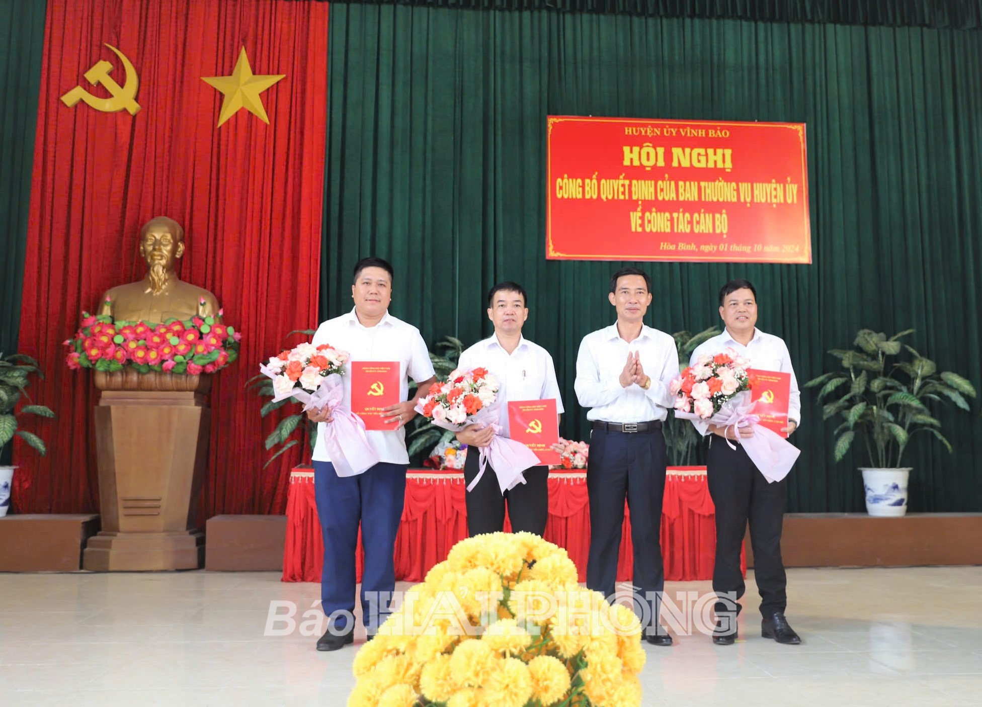 Ngày 1/10, Huyện ủy Vĩnh Bảo thành lập 10 đoàn công bố các quyết định của Ban Thường vụ Huyện ủy về công tác cán bộ tại 7 xã, thị trấn và một số phòng, ban trực thuộc huyện.