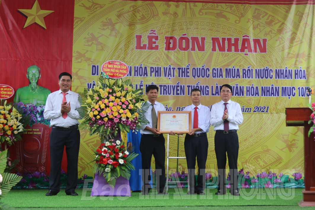Với những giá trị lịch sử, văn hóa quý báu, ngày 20-12-2019, Bộ trưởng Bộ Văn hóa, Thể thao và Du lịch ra quyết định đưa Nghệ thuật trình diễn dân gian múa rối nước Nhân Hòa vào danh mục di sản văn hóa phi vật thể quốc gia. Tuy nhiên, do ảnh hưởng của dịch bệnh COVID-19, đến nay, huyện Vĩnh Bảo, xã Nhân Hòa mới có dịp tổ chức lễ đón nhận. Lễ đón nhận trùng với hội làng Nhân Mục nên thu hút đông đảo người dân địa phương, con em của làng Nhân Mục từ khắp nơi và du khách tham dự./.