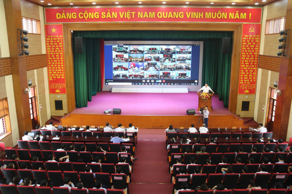 Hội nghị được kết nối trực tuyến từ điểm cầu Trung tâm Văn hoá Nguyễn Bỉnh Khiêm đến hội trường 30 xã, thị trấn.
