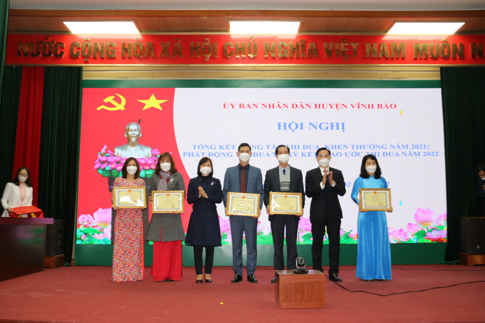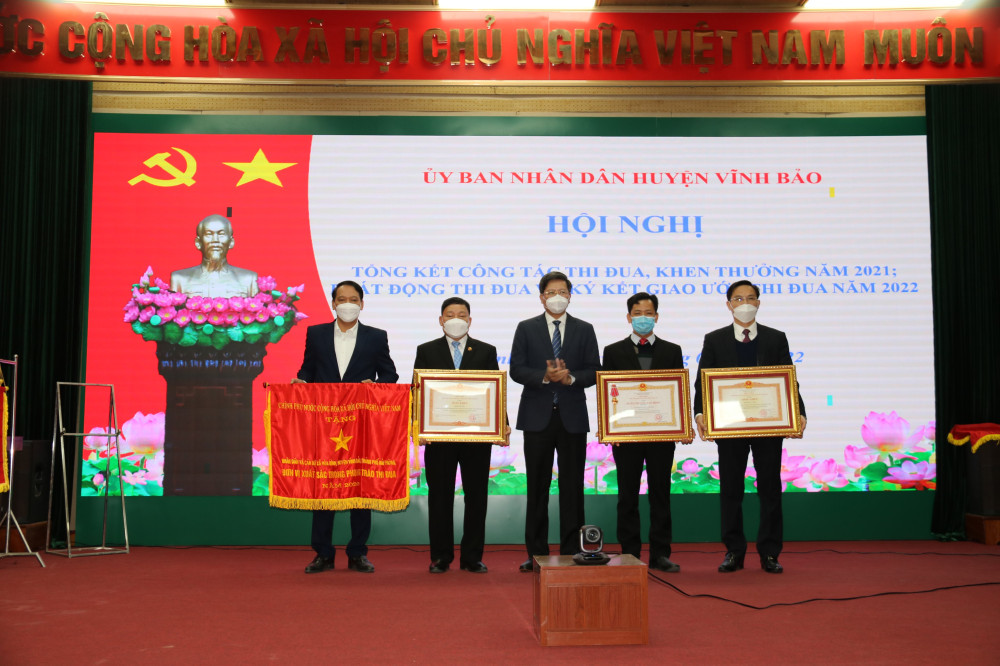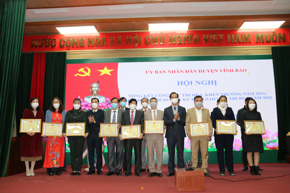 Tại Hội nghị này, Hội đồng thi đua-Khen thưởng Huyện Vĩnh Bảo đã công bố các quyết định khen thưởng cho các tập thể, cá nhân đạt thành tích xuất sắc trong các phong trào thi đua năm 2021. Theo đó: Văn phòng Huyện ủy Vĩnh Bảo được tặng thưởng Huân chương Lao động hạng Ba; Nhân dân và cán bộ xã Hòa Bình được nhận Cờ thi đua của Chính phủ; 2 cá nhân được nhận Bằng khen của Thủ tướng Chính phủ. UBND thành phố tặng: Cờ thi đua cho 5 tập thể, danh hiệu tập thể lao động xuất sắc cho 14 tập thể; Bằng khen cho 21 tập thể, 7 cá nhân có thành tích hoàn thành xuất sắc nhiệm vụ công tác từ năm 2020-2021; cùng nhiều tập thể, cá nhân được nhận Giấy khen của UBND huyện.