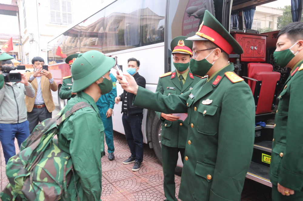 Sau buổi lễ, các chiến sỹ trẻ thực hiện việc đo thân nhiệt trước khi lên xe trở về đơn vị.