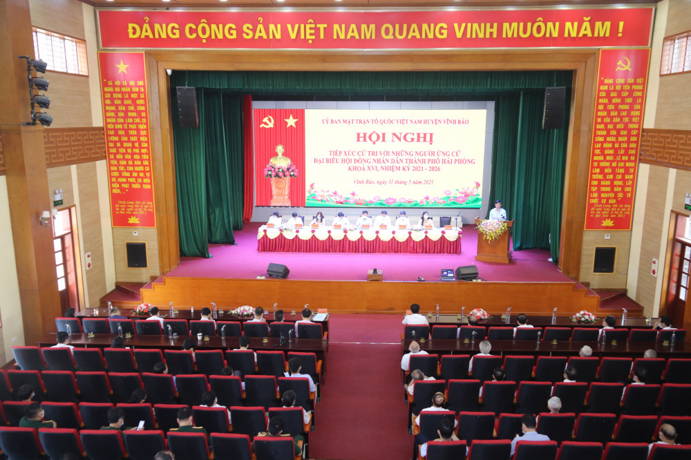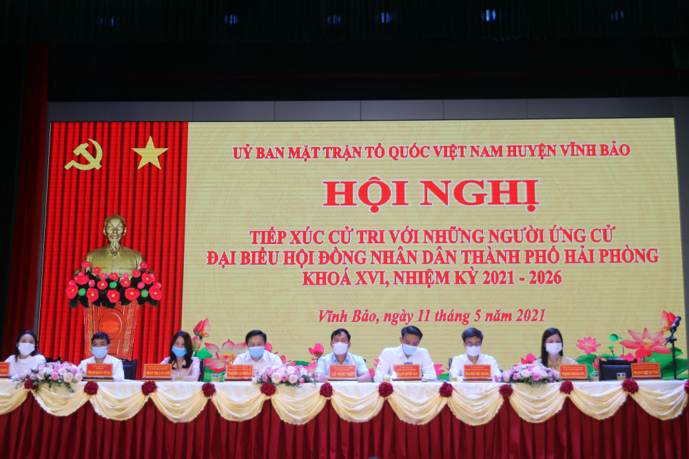 Sáng 11/5, các ứng cử viên đại biểu HĐND thành phố khóa XVI tại đơn vị bầu cử số 10 đã về tiếp xúc cử tri tại huyện Vĩnh Bảo. Để đảm bảo các biện pháp phòng chống dịch COVID-19, cuộc tiếp xúc thực hiện theo hình thức trực tuyến và phát thanh trực tiếp, từ điểm cầu Nhà văn hóa Nguyễn Bỉnh Khiêm tới điểm cầu của 30 xã, thị trấn trên địa bàn huyện Vĩnh Bảo với khoảng hơn 1.000 cử tri tham dự.