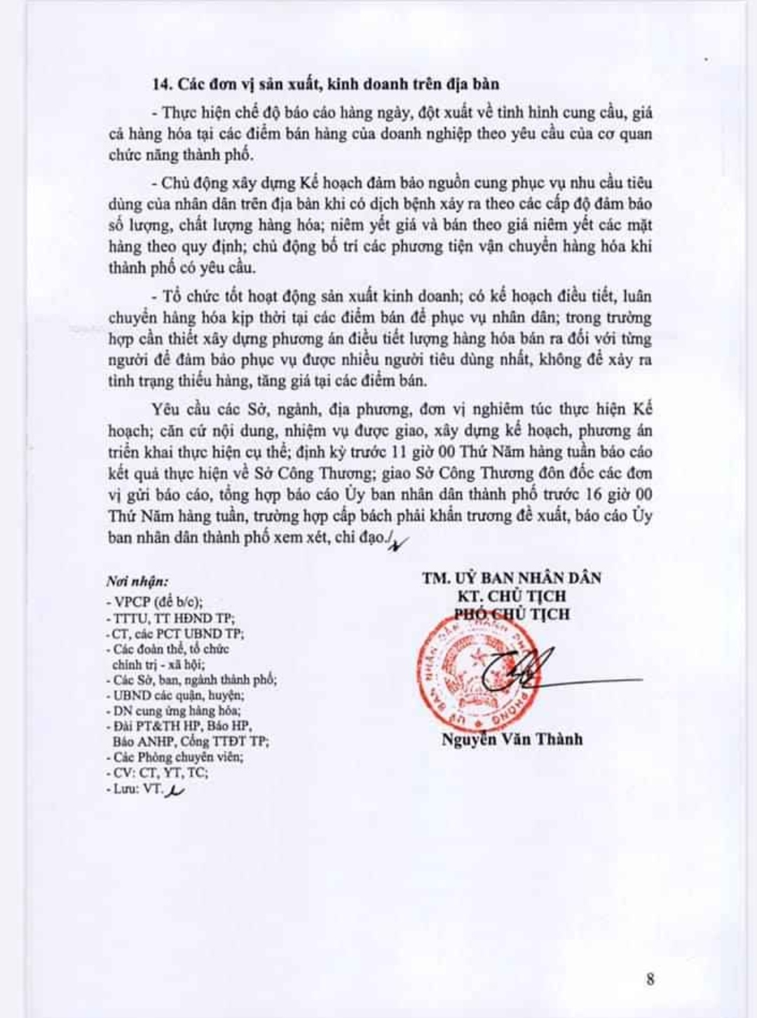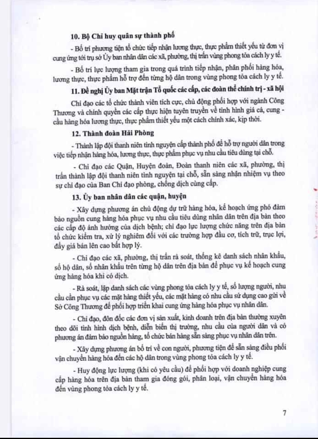 Theo đó, yêu cầu các doanh nghiệp đảm bảo dự trữ, cung ứng hàng hóa đủ số lượng, chất lượng, vệ sinh an toàn thực phẩm theo sự điều phối của các cơ quan chức năng để kịp thời hỗ trợ đảm bảo nhu cầu tiêu dùng thực phẩm thiết yếu cho nhân dân ở khu vực bị phong tỏa cách ly y tế do dịch bệnh; Các cơ quan Nhà nước tổ chức mua và hỗ trợ đưa hàng hóa thiết yếu đến các hộ dân tại khu vực cách ly (có dịch) bảo đảm đầy đủ, kịp thời.