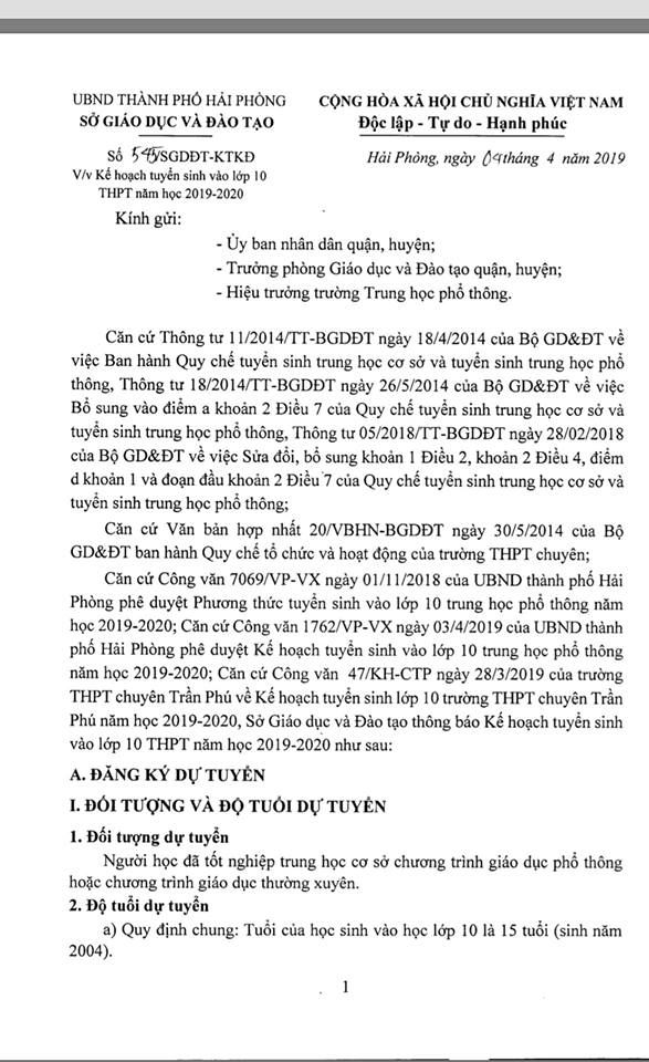 Sở Giáo dục và Đào tạo vừa có văn bản số 545/SGDĐT-KTKĐ gửi UBND các quận, huyện, Trưởng phòng Giáo dục và Đào tạo quận, huyện; Hiệu trưởng trường Trung học phổ thông về Kế hoạch tuyển sinh vào lớp 10 THPT năm học 2019 – 2020.