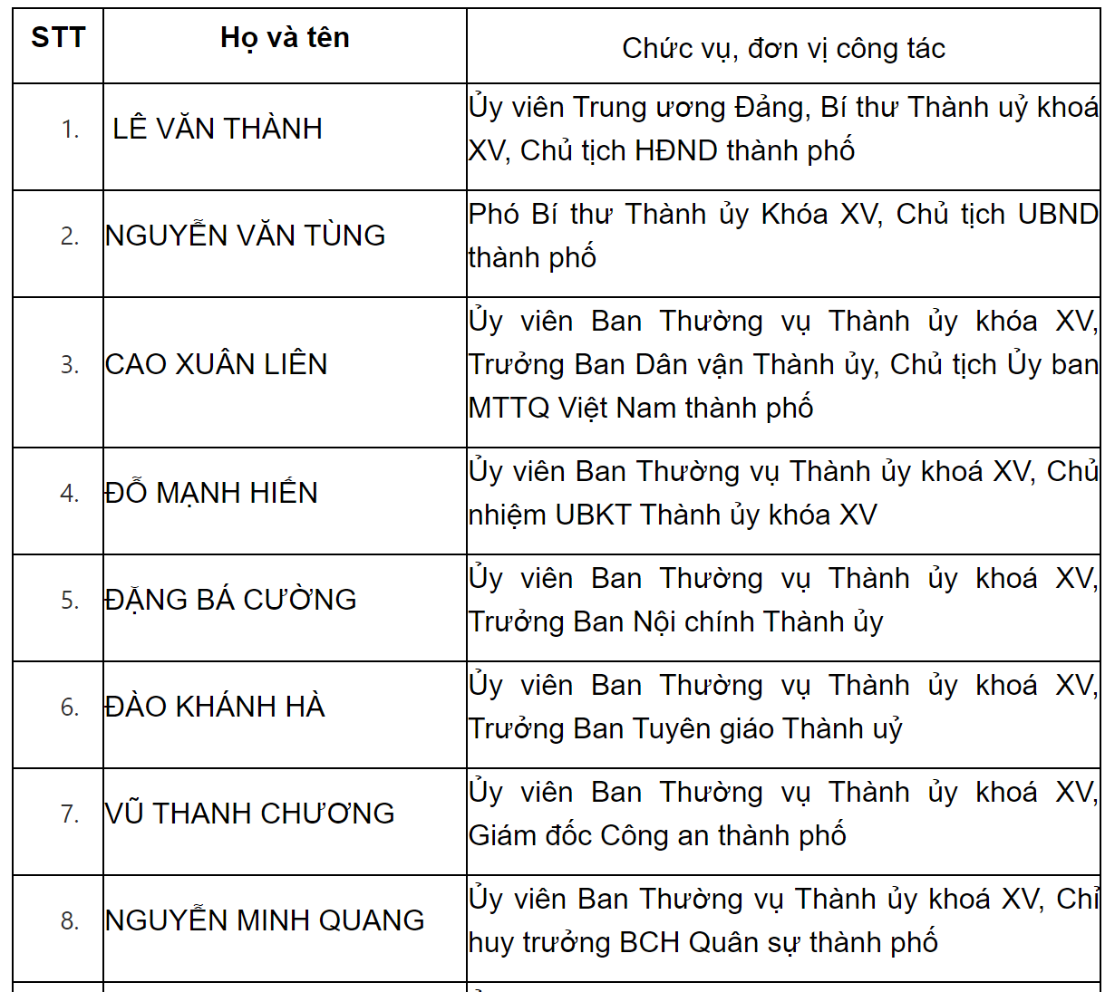 I. Kết quả bầu cử Ban Thường vụ Thành ủy khóa XVI gồm 15 đồng chí: