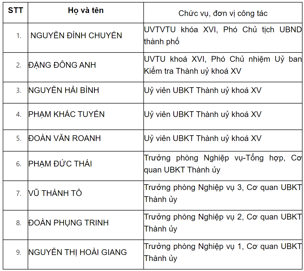 III. Kết quả bầu Ủy ban Kiểm tra Thành ủy khóa XVI gồm 09 đồng chí: