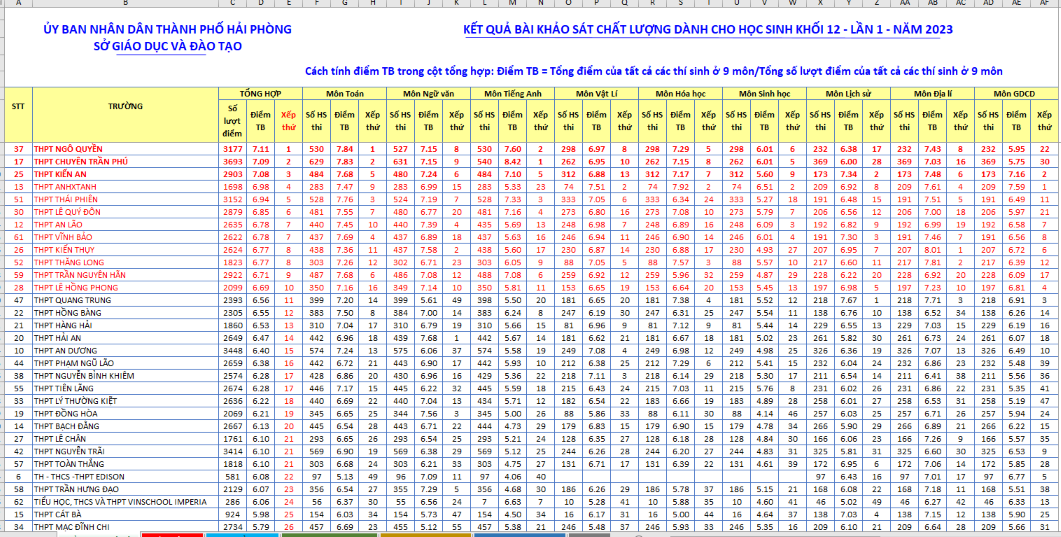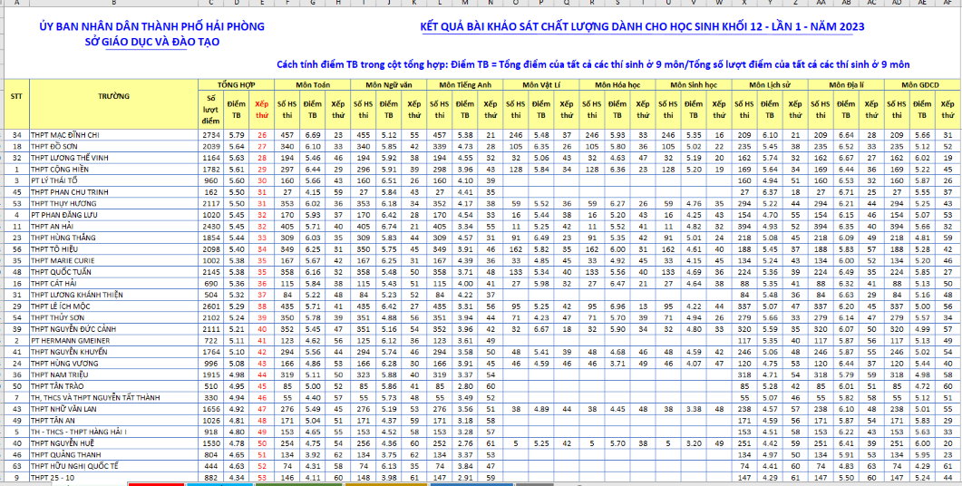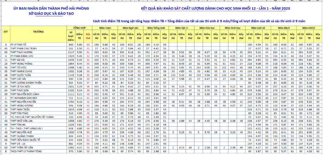 Thực hiện văn bản số 2766/SGDĐT-GDTrH ngày 31/8/2022 của Sở Giáo dục và Đào tạo về việc hướng dẫn thực hiện nhiệm vụ giáo dục trung học năm học 2022-2023; nhằm đánh giá chất lượng công tác dạy-học của giáo viên và học sinh, ngày 20-21/4/2023, Sở Giáo dục và Đào tạo (GDĐT) Hải Phòng đã triển khai khảo sát chất lượng học sinh lớp 12 toàn thành phố lần thứ nhất năm học 2022-2023 đối với 09 môn: Toán, Ngữ văn, Tiếng Anh, Lịch sử, Địa lí, Giáo dục công dân, Vật lí, Hóa học và Sinh học với hình thức làm bài thi trên giấy. Ngày 17/4/2023, các đơn vị giáo dục nhận đề khảo sát đã niêm phong từ Sở GDĐT, tiến hành sao in đề, tổ chức triển khai khảo sát theo lịch của Sở, coi-chấm bài khảo sát nghiêm túc, đúng quy định và báo cáo kết quả về Sở GDĐT trước ngày 28/4/2023.